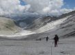 Son las 8 de la mañana y ya estamos a 3.617 mts. de altitud. Ahora solo tenemos que seguir unos hitos y senda que sube, remonta por las piedrecillas fáciles este cordal rocoso, hasta que dicha senda nos envíe al otro lado, hacia un paso vertiginoso de la rimaya del nuevo glaciar.