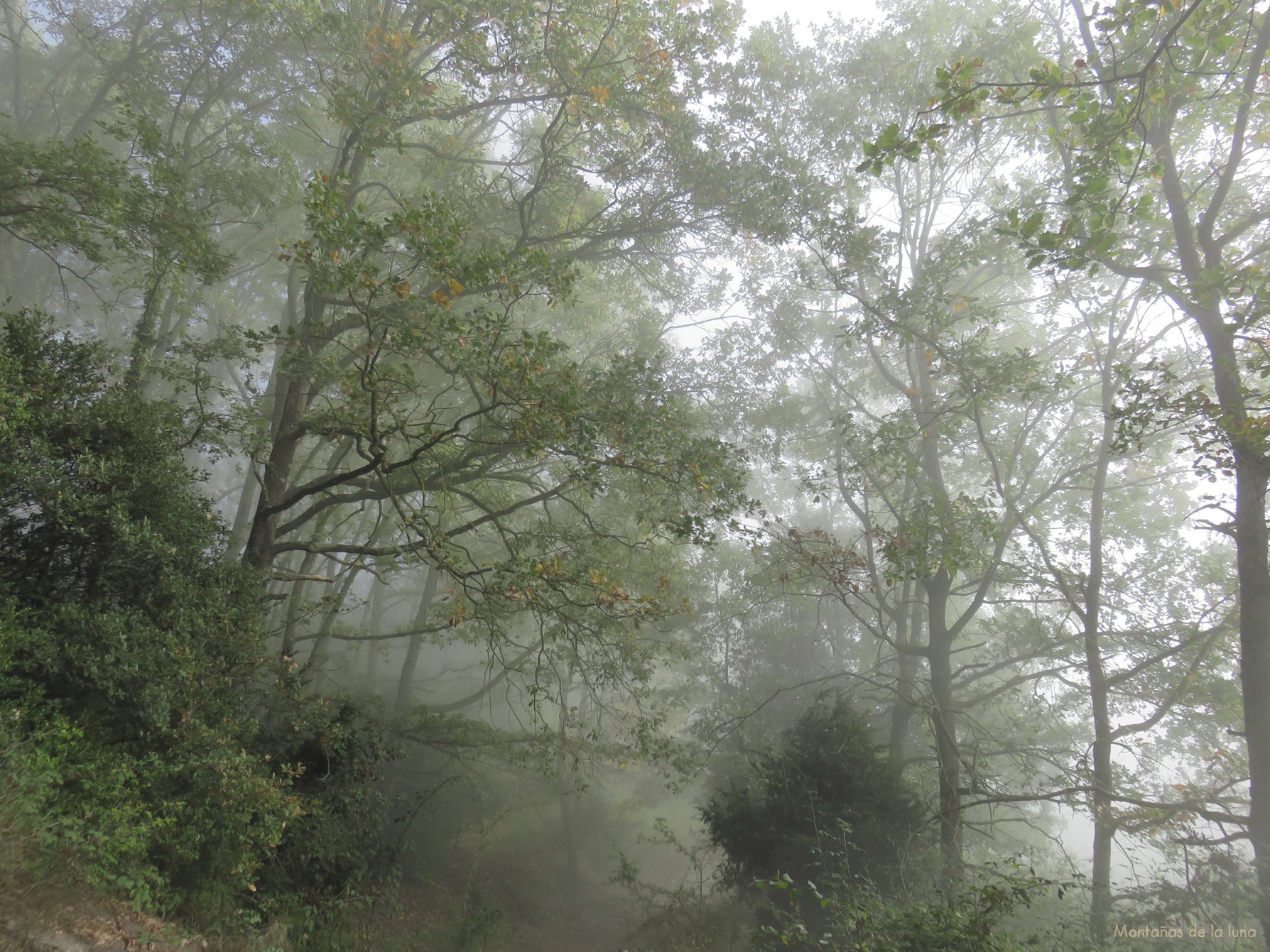 El bosque, hayedo, robledal… es estupendo, saco fotos, excepcional como muchos hayedos al norte, noreste de Cataluña, mientras después de ir cogiendo altura progresivamente pero no exageradamente, llegamos a otro cruce arriba de la montaña, que comienza a despejarse algo de bosque: el G.R. hacia Cantonigròs sigue hacia el norte y derecha, nosotros seguiremos hacia el sureste y recto, en busca de las cimas de esta montaña: el Puig de Cortils y la Roca Llarga.