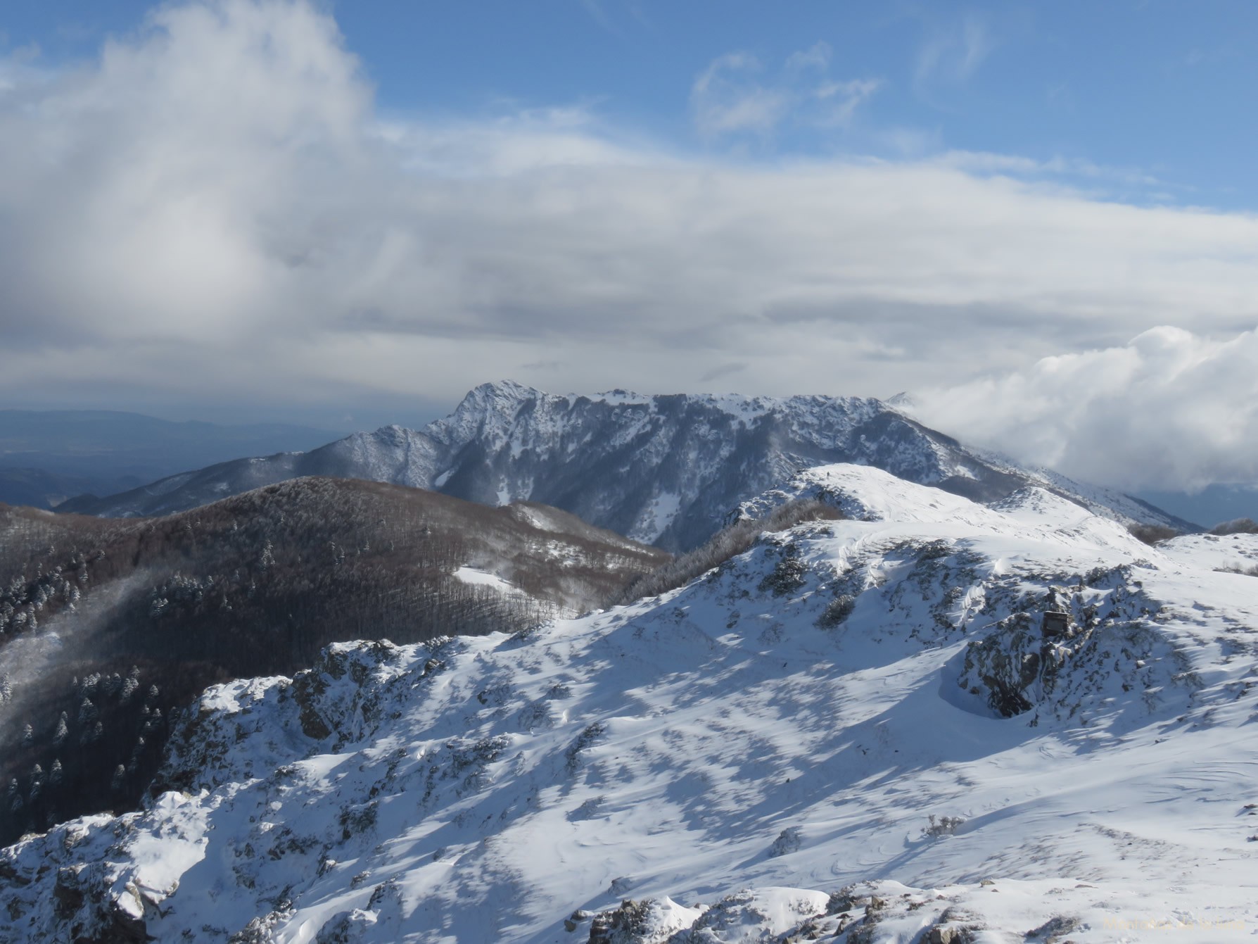 Pero al final ya llego a la cima del Matagalls, 1.696 mts. Hago videos y fotos al paisaje. Alguna selfi. Observo el bello paisaje nevado de las otras cimas del Montseny, como Les Agudes con su semblante casi alpino, escarpado. No hay mucha gente, pero alguna llega de Collformic por la ruta fácil y habitual. El recorrido que he realizado lo he hecho prácticamente en solitario, solo algunos perdidos bajaban por el Pla del Ginebres en busca de Coll Saprunera.