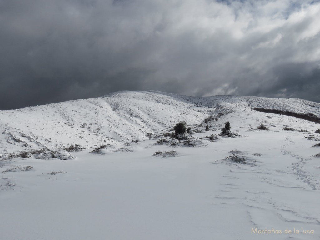 Más arriba y siguiendo la huella, el tiempo y el cielo está más despejado, y las vistas y paisaje nevado de la cima del Montseny son extraordinarios. Llego al Collet de La Font por si a la izquierda quiero girar en busca de la Font del Matagalls al final del hayedo, pero decido no entretenerme demasiado y seguir recto hacia la cima. Llegados a un punto en la alta planicie cimera y ondulada, las huellas giran hacia la izquierda y dejo de dirección sureste para seguir hacia el este. Entre este punto y la cima del Matagalls que puedo observar al final de las pisadas, hay rincones con mucha nieve acumulada por el viento, y las huellas tienen que pasar por los arbustos y altas plantas que sobresalen entre la nieve, para no hundirme en ella… aún así, a pocos metros de la pequeña subida final hasta la cruz, hay zonas con mucha nieve que hacen te esfuerces más de la cuenta en progresar por ella.