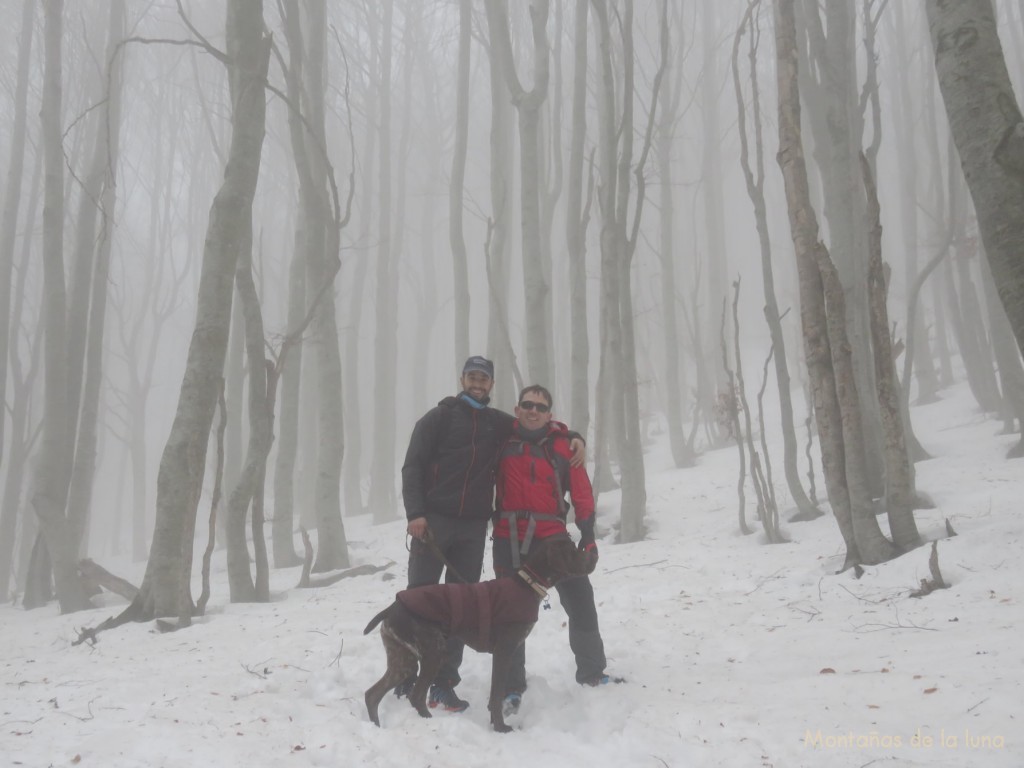 Después de recorrer algo la cima bajando del Matagalls entre las pisadas y la senda escondida en la nieve hacia el sureste, nos internamos en el estupendo hayedo, lleno de abundante nieve que habita este lugar. Es fantástico y precioso también: entre la blanca y vaporosa niebla, la blanca y esponjosa nieve, los altos, espléndidos y casi amenazadores troncos y ramas limpias de hojas… frondoso, mágico, impresionante… bajamos corriendo, riendo entre la nieve y la suave pero contundente pendiente entre el hayedo; hasta un claro de pendiente más suave: Coll Pregón (1.532 mts.)… reconozco la piedra, el menhir, del centro de lo que sería el collado, el prado.