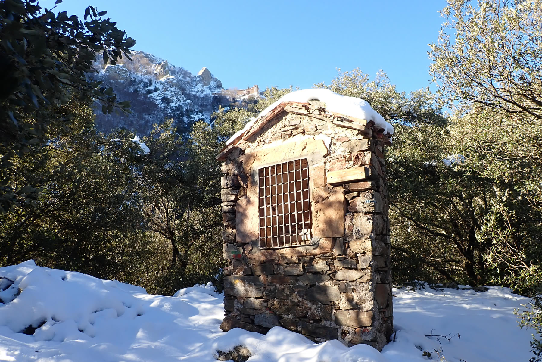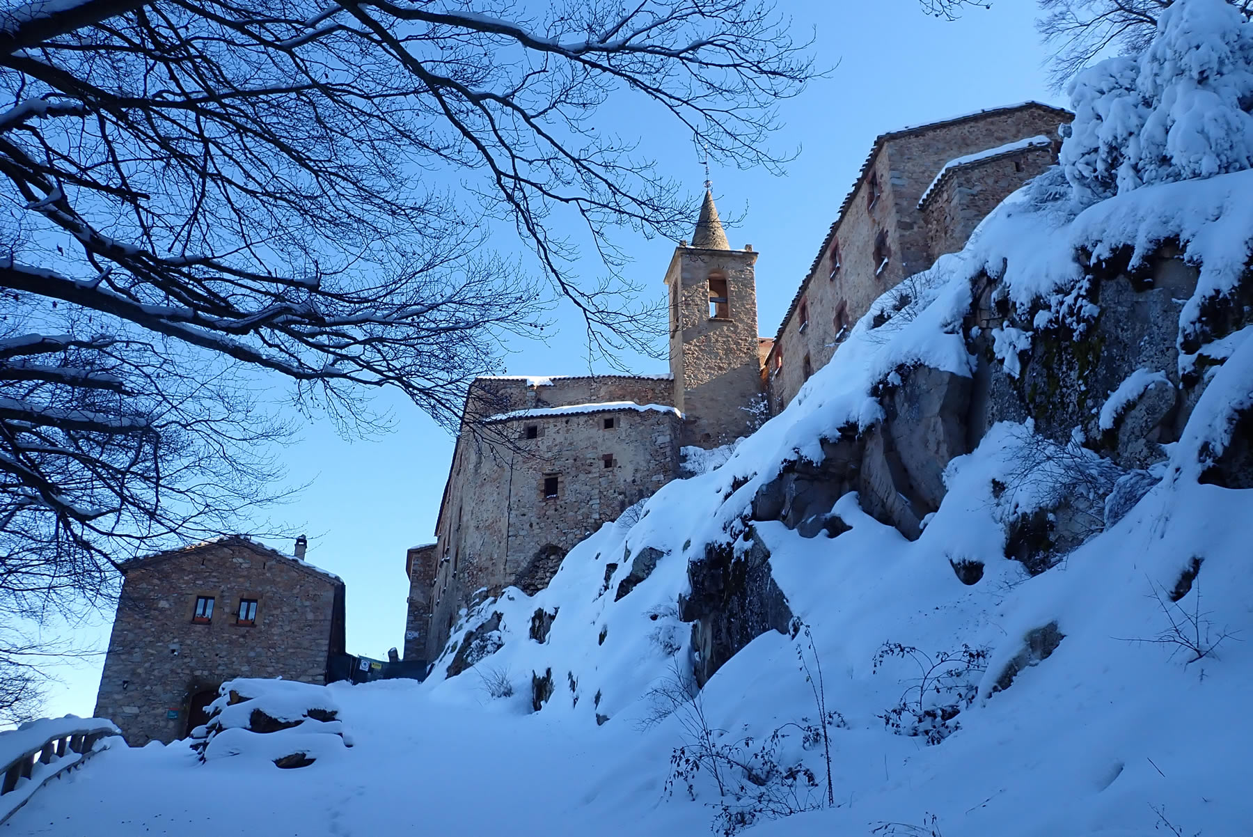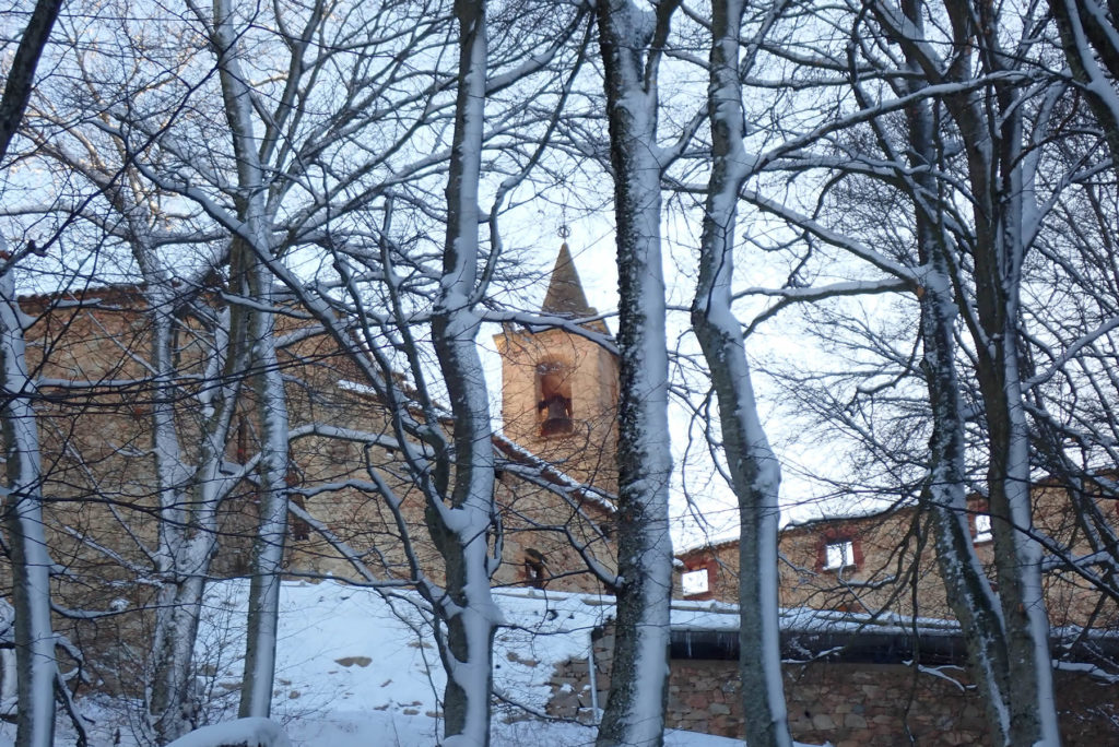Subo al camino y giro en él a la izquierda para llegar y visitar el magnífico conjunto de Sant Segimon. Llevo unas dos horas y ya tengo hambre. Me paro en la puerta de la “actual” posada de Sant Segimon para almorzar y descansar un poco. El día sigue nublado. Es el típico frío día de invierno, entre nieves y nubes, nieblas, blancas, grises claro. Hay una linda niña que se divierte tirándose con un trineo por la rampa nevada del camino que se interna entre los edificios. Aparece un grupo de excursionistas con los que ya me había topado y adelantado en la ermita y refugio de l’Erola. Han cogido otro camino, directo hacia los muros de la construcción, que les hará girar a la derecha hasta poder llegar a un punto en el que puedan subir al camino.