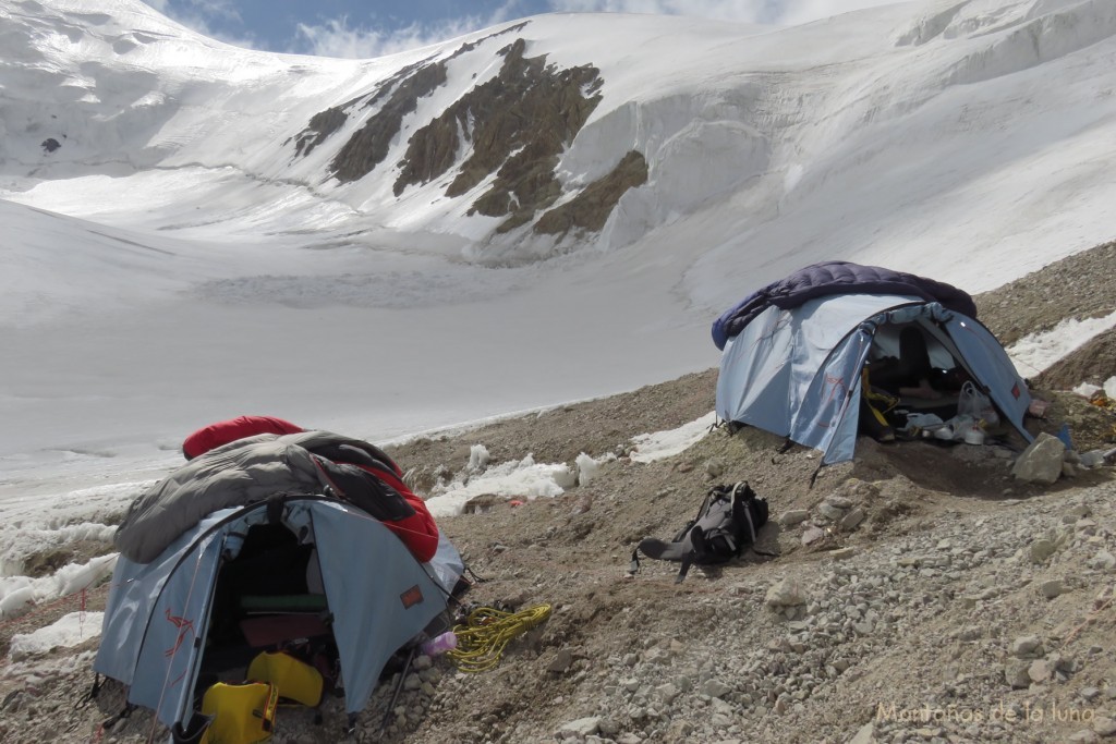Comemos y descansamos. Hablamos con otro alpinista español que no es su primera vez que viene a esta montaña. Se le ve fuerte y tranquilo, y está el solo. No recuerdo si era de Madrid o de Ávila, o sea, del centro de la península. Llegará a hacer cima sin problemas, como si subiera a la Sierra de Callosa. Sorprendente… igual ya venía aclimatado de algún otro sitio, al menos ya parecía que estuviera aclimatado.