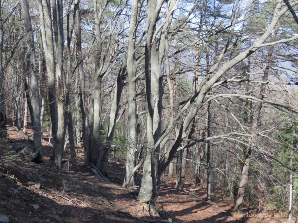 La senda está muy bien marcada con sus revueltas y señalizaciones. No hay pérdida. En cada crucecillo siempre nos encontramos con algún cartel indicador que nos dirige por el camino a seguir. Perfecto. Cruzamos ahora una parte de la montaña que es un gran bosque de hayas, precioso, con ejemplares magníficos dignos de ser fotografiados e inmortalizados.