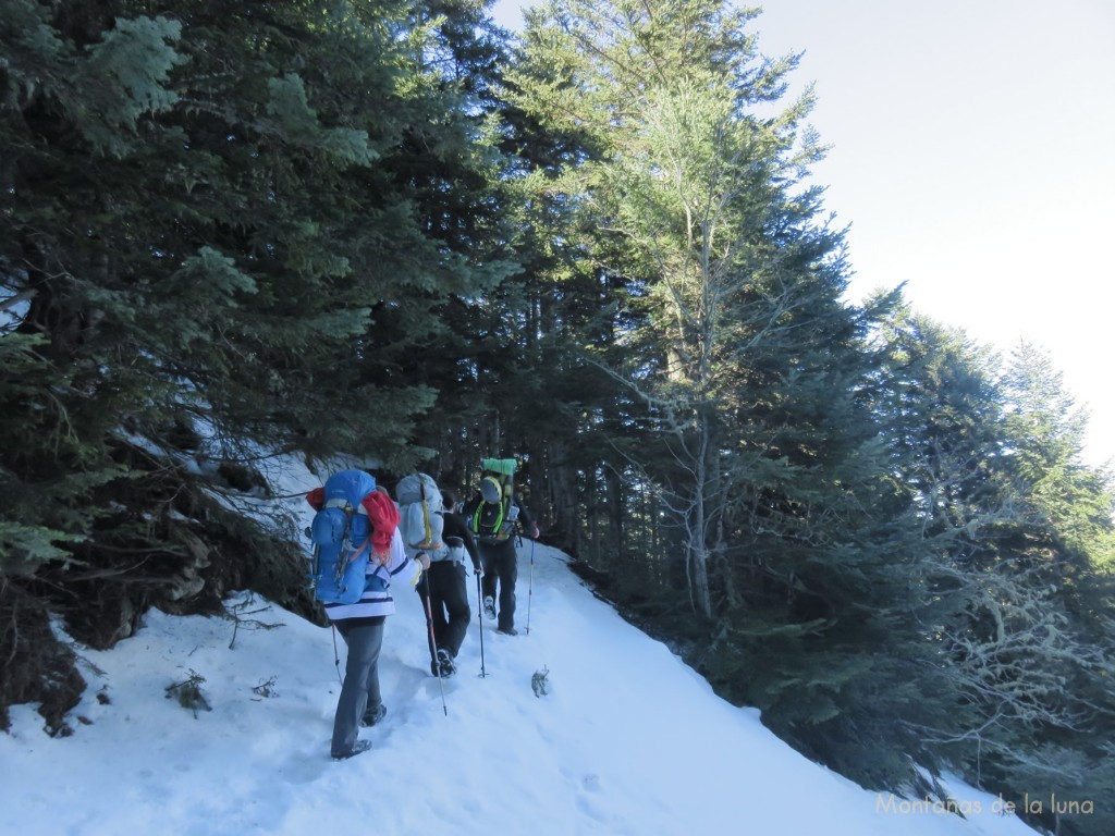 Conforme vamos cogiendo altura la nieve o los pequeños neveros hacen acto de presencia por en medio del bello bosque, preludio de lo que nos encontraremos más arriba. Aunque hemos subido mucho, o estamos subiendo mucho, no estamos a mucha altura, al comenzar la marcha a tan baja altura, con lo que el planteamiento de encontrar abundante nieve, no lo teníamos al comenzar la marcha. Por suerte el día acompaña con una luminosidad y unas nubes altas que hacen que el sol no moleste.