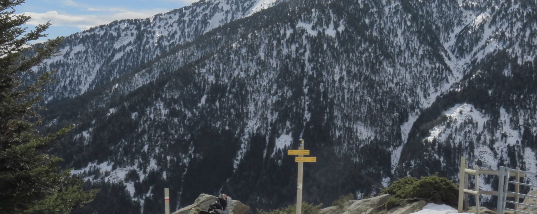 Más arriba, después de estar subiendo, caminando con los mochilones un buen rato por el bello bosque cada vez más nevado, nos topamos con una sobresaliente roca que se encuentra a mil novecientos metros de altitud, y presidiendo un largo brazo, cordal que viene desde la misma base del Refugio des Cortalets o de las alturas del Canigó, hacia el norte en línea recta. Este cordal es el que tendremos que seguir para llegar hasta el refugio; estamos pues, en las laderas de la Roca del Mosquito. Aquí nos encontramos otro cruce, podemos bajar a la población de Taurinya desde aquí, pero nosotros seguimos hacia Les Cortalets… ¡¡Aún quedan seis kilómetros y medio!!