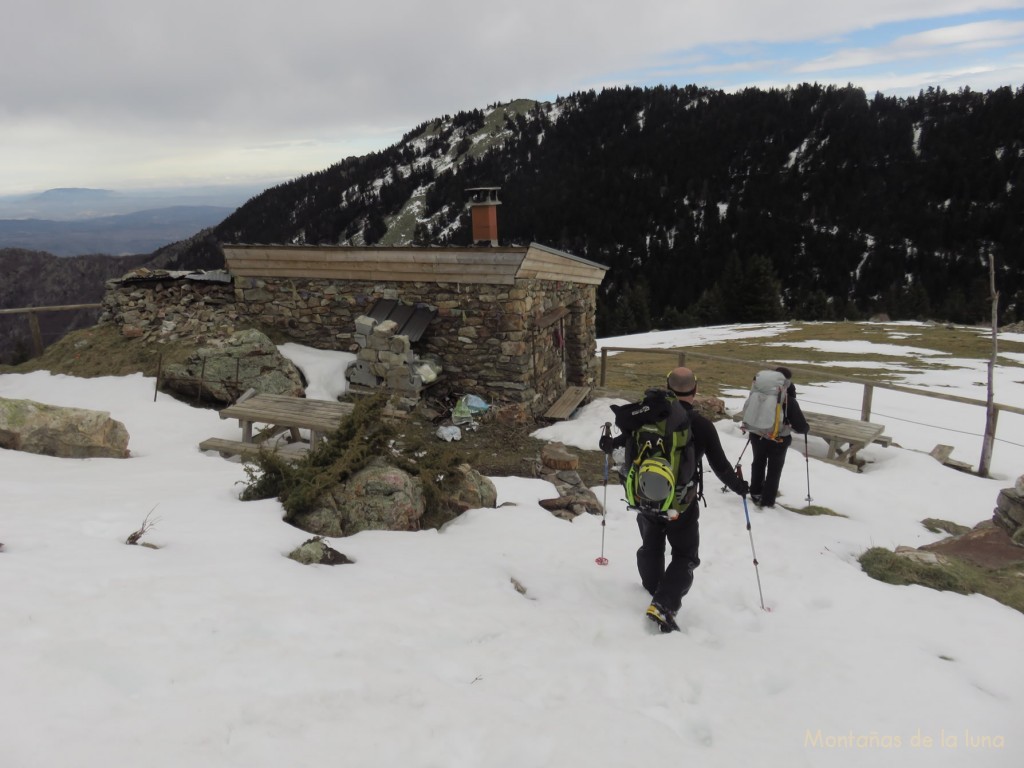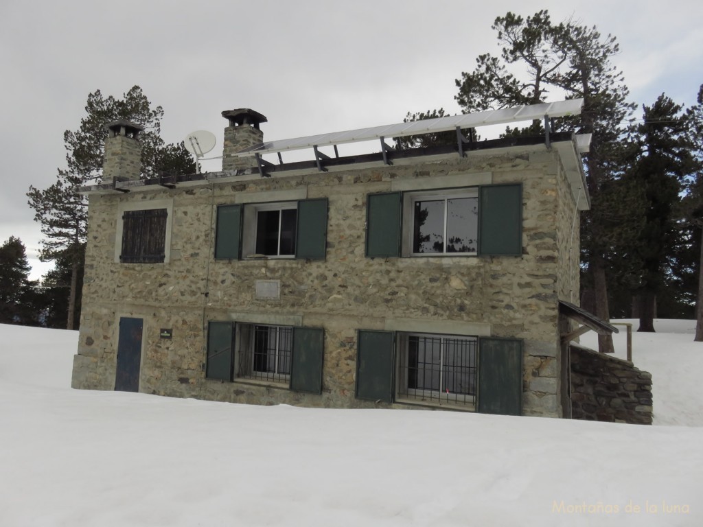 sin llegar a ser noche cerrada. Ya estamos a 2.150 metros de altura a la que se encuentra el nombrado refugio. Es una estructura o caserón recio y hasta diría que grande, soberbio, bien plantado. Construido en un excepcional falso llano con vistas a las cimas del Canigó, allá algo lejos, y rodeado por el bosque con algún que otro balcón, mirador, al horizonte. Encantador. Nosotros nos dirigimos a otra casa de una planta que queda separa del caserón grande y principal, éste es el refugio de invierno, que ya de por sí, es un magnífico y espaciado refugio… casi como algunos guardados españoles.