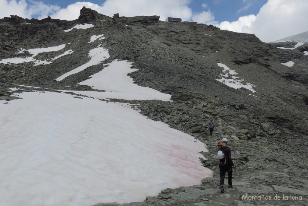 Después del descanso proseguimos senda arriba. El camino es fácil y muy intuitivo, no hay nada de perdida, es una amplia ladera que sube con el puntito del refugio al final de la misma allá arriba. Nos queda una hora y media a dos horas para llegar. Las montañas están cubiertas, no podemos admirar y observar esas gigantescas estructuras de la tierra. A mitad de esta subida me quedo mirando hacia arriba a la derecha: se intuye la fabulosa pared del Weisshorn, solo aprecio su base, con pequeños neveros que cuelgan de los pequeños rincones donde la pared no es tan vertical, pero a la vez me imagino el resto de la pared, como una pirámide inexpugnable, oscura e intimidatoria. Fabulosa.