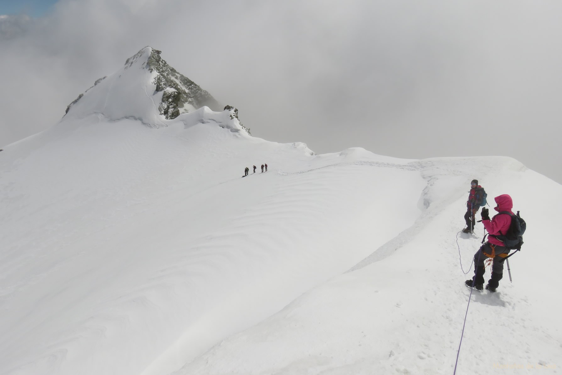 Estamos todos en la cima. Es una pena que esté nublado, cubierto, con nubes que van y vienen y nos tapan las increíbles vistas que esta montaña tiene. Siguiente al pico una formidable y temible cresta y puntas, alta punta, del Weisshorn, humeando como una montaña en llamas, recorrida por esas nubes el altivo perfil de esta escarpada y preciosa montaña. El resto del paisaje, mirando al Mattertal, no se ve por las nubes, que incluso deberíamos ver el Cervino, Monte Rosa… ¡¡lástima!!, pero hemos llegado todos a la cima.