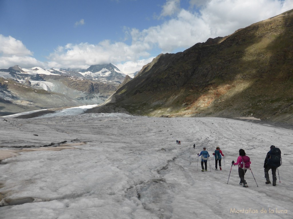 Una vez hemos cogido la loma cimera, en el centro de la lengua glaciar, giramos a la izquierda siguiendo la lengua glaciar hacia abajo, caminando y haciendo un recorrido durante un buen rato, hasta observar como las balizas se paran en una orilla fácil del glaciar junto a una especie de llano bajo la cresta de Gorner. Aquí hay numerosos grupos que quieren caminar por el glaciar y puede que muchos de éstos no se han puesto unos crampones en su vida.