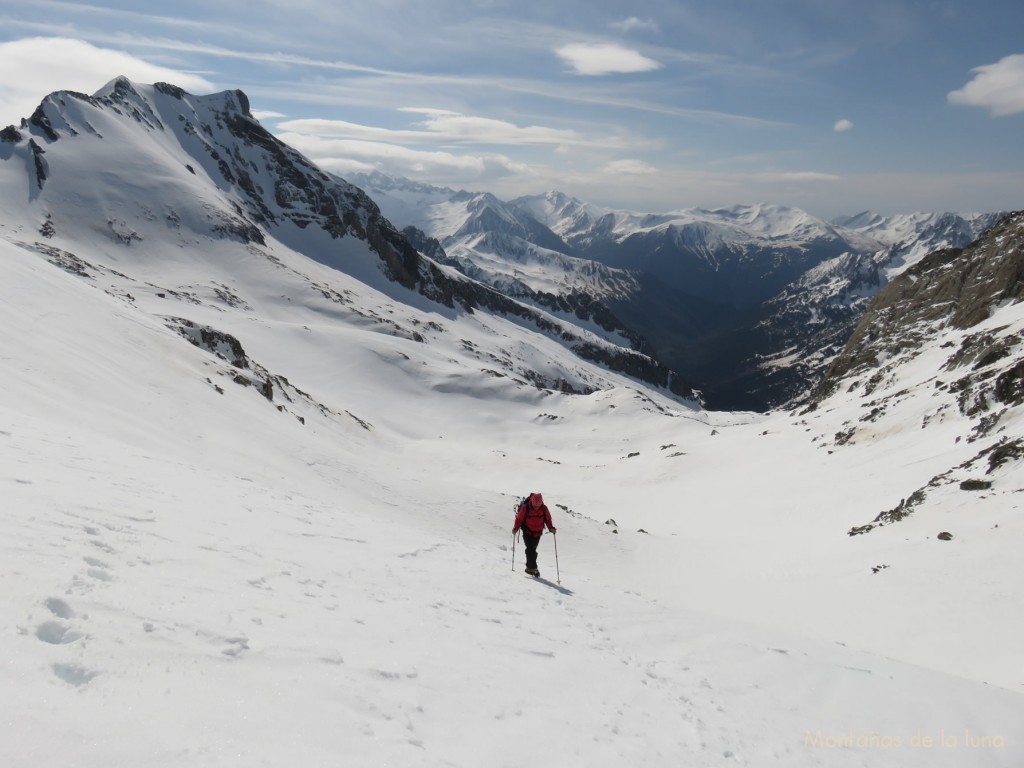 Pero al final se va subiendo, superando muy bien a pesar de la inclinación. Pero no debemos de meternos en el mismo sitio donde nos paramos hace 2 años en Invernal en el Valle de Estós. Por suerte hay más nieve y mejor. La idea es seguir en zigzag o por donde podamos, pero sin perder el surco del barranco por donde en verano baja el agua, valle arriba hasta que, en un determinado lugar, hay un falso llano, donde nos olvidaremos el seguir lo más profundo del valle, para girar un poco a la izquierda, como si buscáramos aquellas puntas escarpadas que van a ir asomándose poco a poco allá arriba mientras subimos la vista hacia el horizonte de nuestra dirección.