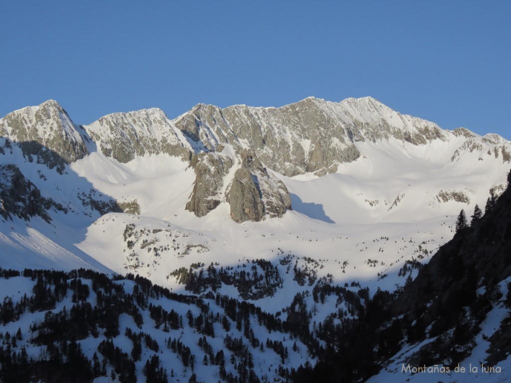 Pero antes de llegar al comienzo o antes de internarnos en los restos del alud que bajan de las crestas del Seil Dera Baquo, el sol hace acto de presencia despejándose algo el cielo y dando un aspecto, un paisaje más hermoso si cabe, más magnífico y precioso, en este rincón del gran Pirineo de Huesca. Incluso a la vez que bajamos las pocas nubes que van quedando se van desvaneciendo para dar paso de nuevo a ese cielo azul profundo y tan limpio, con el que comenzamos la ascensión.