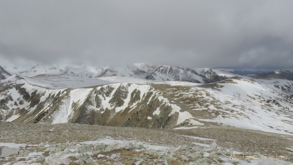 El tiempo sigue nublándose pero sin ser amenazador, haciendo un juego de colores blancos entre éstas y el nevado terreno. Ya me da la impresión de internarme en la soledad y quietud de la alta montaña, otro mundo, otra atmosfera. Fantástico. Giro la cabeza hacia la ladera que coge altura muy suavemente a la derecha, y veo justo arriba de ella una pareja de montañeros en un conjunto de grandes rocas que hacen de cima. “Entonces es allá arriba la primera cima”, digo para mí; y comienzo a subir directo por ladera hacia las rocas, dejando el recorrido supuestamente marcado del G.R. atrás, dejando que siga su marcada senda hacia el centro de esta nevada llanura y meseta, Camp Magre.