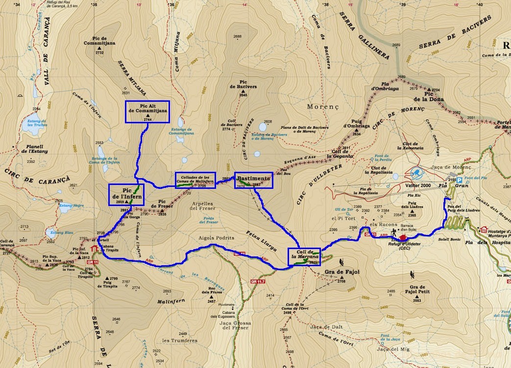 A partir de ahora ya es el recorrido de vuelta al coche, al parking de Ulldeter y Vallter 2000. Y lo que haremos es seguir las indicaciones de la anterior actividad con subida al Pic de Freser y Pic de l’Infern: salir del Pic de l’Infern siguiendo su cordal cimero hacia el oeste, hasta El Portell, desde donde bajamos pasando cerca de la cabañita de piedra (Barraca de Tirapits) y seguir todo el valle al sur del Pic de l’Infern, Pic de Freser hacia el este, por la senda o recorrido del G.R., en busca del Coll de La Marrana. Una vez en el Coll de La Marrana, seguir el camino habitual que pasa por delante del Refugio de Ulldeter y llega hasta la carreterilla y parking cerca de Vallter 2000 donde tenemos aparcado el coche.