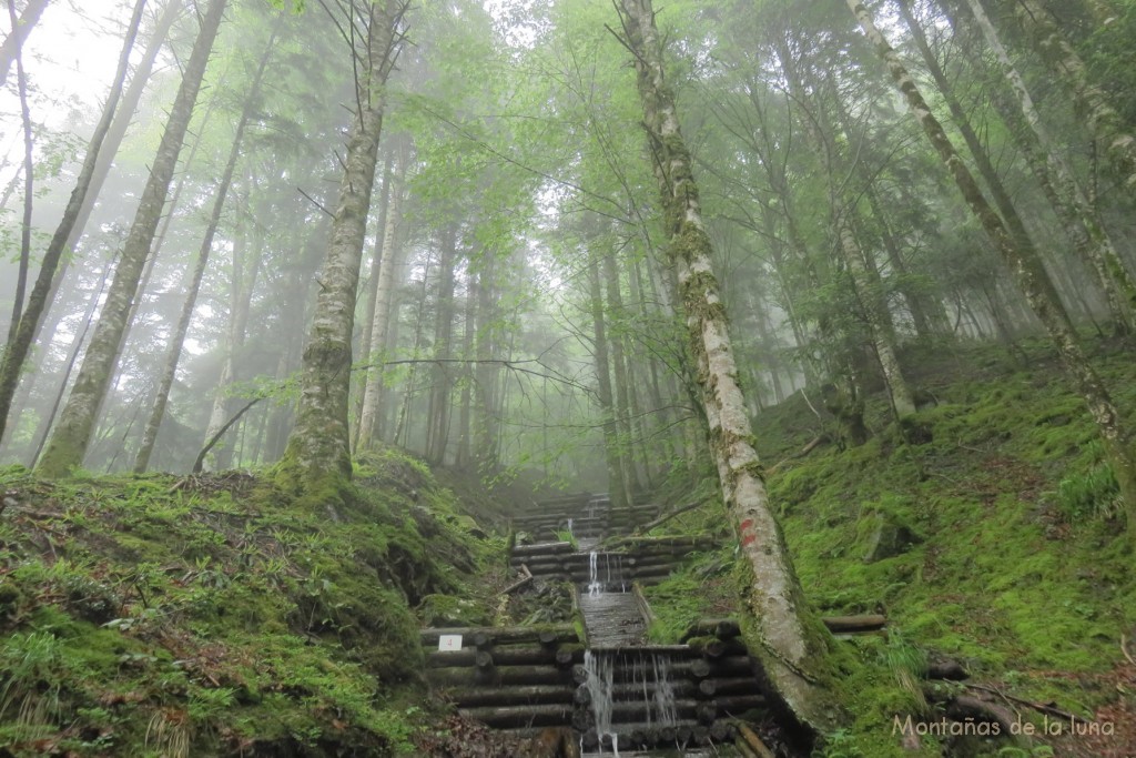 Más arriba, el bosque ya está más claro, desaparecen las hayas y aparecen más calvas, prados y zonas con menos o nada de arbolado. Debemos girar a la derecha. Llevábamos dirección sureste paralelos al río Houradade. Ahora giramos como en diagonal por la ladera o perfil de la montaña (que sigue invisible por a niebla y nubes bajas), hacia el oeste, cogiendo menos altura, como atravesando esa ladera o parte de la montaña. De esta manera pasamos por pasarelas metálicas de malla agujereada, para que puedas ver hacia abajo al otro lado de estos agujeros, el fondo del rabioso y turbulento rio que baja de la montaña. Verdaderas aguas bravas que gritan con todo grave o agudo, cada vez que chocan entre ellas o con las rocas en esta rápida y temible bajada de la montaña hacia el fondo del valle o hacia el río Houradade.
