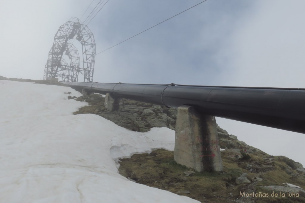 Poco más arriba, la senda cruza por debajo de la nombrada tubería, por debajo de los altos cables del funicular, con un escrito en uno de los soportes, pedestales de hormigón de la misma tubería, que en rojo y dibujado una flecha, nos indica el camino hacia el ya cercano Refugio de Maupas… aunque la niebla no se disipa; da la sensación de que estará acompañándonos toda la actividad… aunque de vez en cuando y ahora que ya estamos a más altura, algún clarito deja ver el cielo azul arriba entre las nubes, las nieblas… eso es señal de que las nubes están a media altura y desde arriba se quedaran abajo, dejándonos ver un magnífico espectáculo del paisaje pirenaico francés, con el Valle de Lys abajo y la verde cara norte de esta preciosa cordillera.