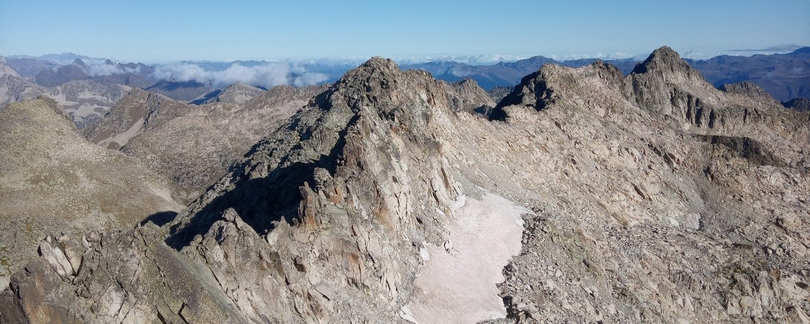 La cresta de los Besiberris desde el Comaloforno, con el Besiberri Sur en el centro, el Besiberri Norte a la derecha, y entre ellos el Besiberri del Mig