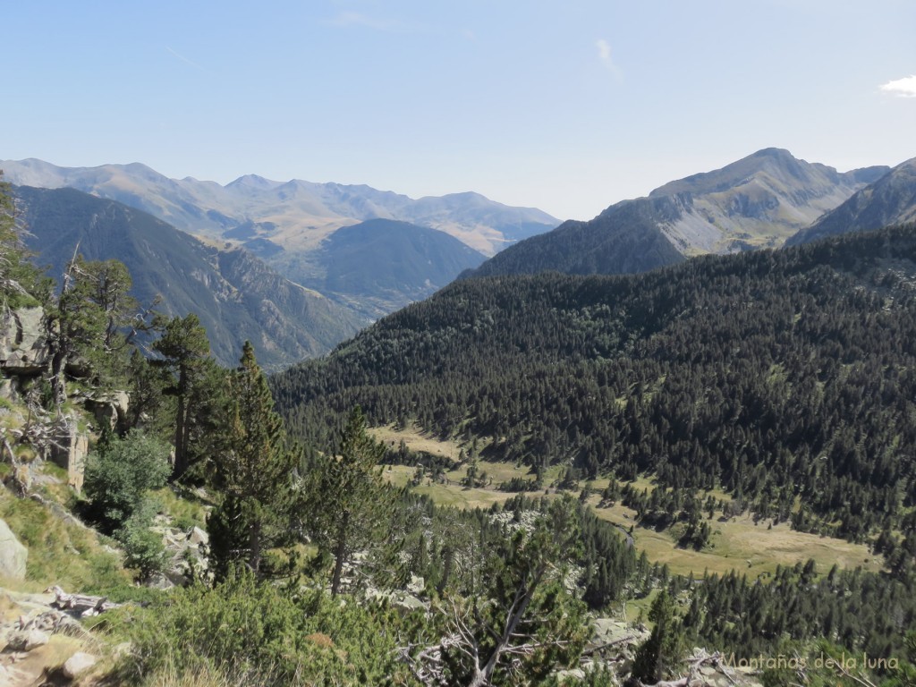 Una vez arriba el paisaje se vuelve a agrandar, detrás hemos dejado unas vistas y unos lugares preciosos, del Valle de Llubriqueto: una perfecta cubeta glaciar con un sano y ordenado bosque a cada lado en sus laderas, y al fondo, detrás, las marronosas pendientes de la alta montaña, y más abajo el invisible fondo del Valle de Boi. Y más con este día soleado y de tan buena visibilidad, el espectáculo está servido… incluso se intuyen, más al fondo, las montañas que cierran o abren el Valle de San Nicolás en Aigüestortes… paisaje que no podremos ver desde el fondo de los valles de los lagos a los que nos dirigimos ahora, más cerrados y escondidos.