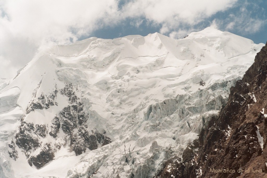Las vistas hacia la montaña y sus perfiles, a medida que subimos y nos acercamos a ella, son espectaculares: una nube ahora sí, ahora no, va cubriendo la cima más alta delante nuestro. Bajando de ella un espectacular glaciar resquebrajado, blanco, imponente que forma un laberinto de grietas, rimayas, seracs, paredes de hielo, según el estado de la inclinación y posición del terreno bajo ellos. La disposición de los mismos sería algo casi indescriptible y solamente explicado mediante la propia visión in situ o en alguna foto. Espectacular.