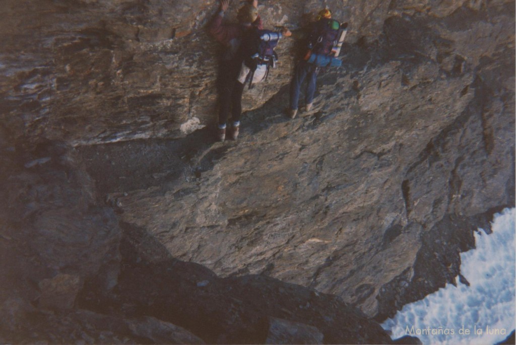 El camino se encarama a los pocos escarpes y perfiles más verticales de esta ladera, esta parte sur del Veleta. Se estrecha. Se va estrechando hasta convertirse en un camino estrecho. Hasta que se corta. Llegados a un punto el caminito parece cortarse sobre una pared sin posibilidad de seguir. Aparece una senda que sigue el perfil de la montaña hasta pasar por una pared rocosa con pocos agarres para las manos. Una especie de paso de pocos metros, pero en el que los pies ven metidos en una repisa cada vez más estrecha, mientras cruzas una pancha de la roca que te impide ver dónde poner los pies y tampoco hay mucho agarre para las manos, es más de equilibrio, y por otro lado echas el cuerpo peligrosamente para atrás por el peso de la mochila, con la intranquilidad de sentir la gravedad que te tira hacia abajo y atrás… Pero el paso es corto. Enseguida estamos al otro lado donde sigue la senda más ancha encaramada a la roca con una bajada escalonada hasta un sitio menos escabroso o escarpado.