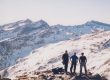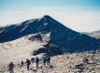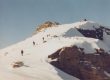 Mientras ya nos despedíamos de la cima (la más alta que había hecho hasta la fecha, y así sería durante unos cuatro años y medio), mirábamos el recorrido a realizar ahora: un paisaje de un color rojizo oxidado, marrón e incluso amarillo de las rocas y piedras de estas pizarras metamórficas, con las pinceladas blancas de esa nieve prematura que vuelve a fundirse a pesar de ir camino del invierno. Precioso, altivo… Sierra Nevada puede ser hermosa en condiciones invernales, con su alta montaña, y sus perfiles de lugares tranquilos, lomas suaves pero en pendiente, contrastadas con esas pequeñas crestas y escarpes, hacen de ella un rincón singular de este Mundo. Allá queda el Veleta, al otro lado del mismo está el collado de La Carihuela. Tenemos que bajar de estos 3.479 mts. para bajar a los 3.050 aproximadamente y volver a subir a 3.210 mts. de La Carihuela y después bajar finalmente a los 2.500 mts. de Pradollano… se ve lejos… nos ponemos los mochilones y mientras mis compañeros ya comienzan a descender desandando el camino realizado para llegar a esta cima, les hago alguna poca foto con el fondo de este paisaje de fábula.