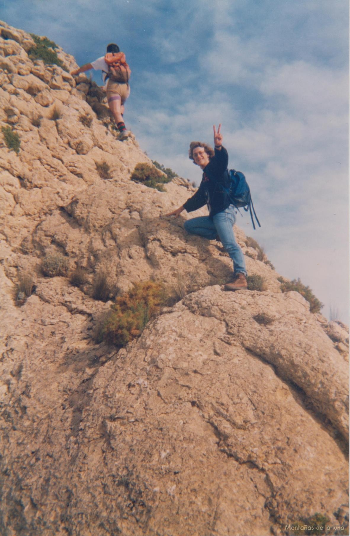 Asun y la hermana de Mónica subiendo a la Penya Migjorn por pasos de roca, al fondo queda la Sierra de La Grana y detrás más alta Aitana