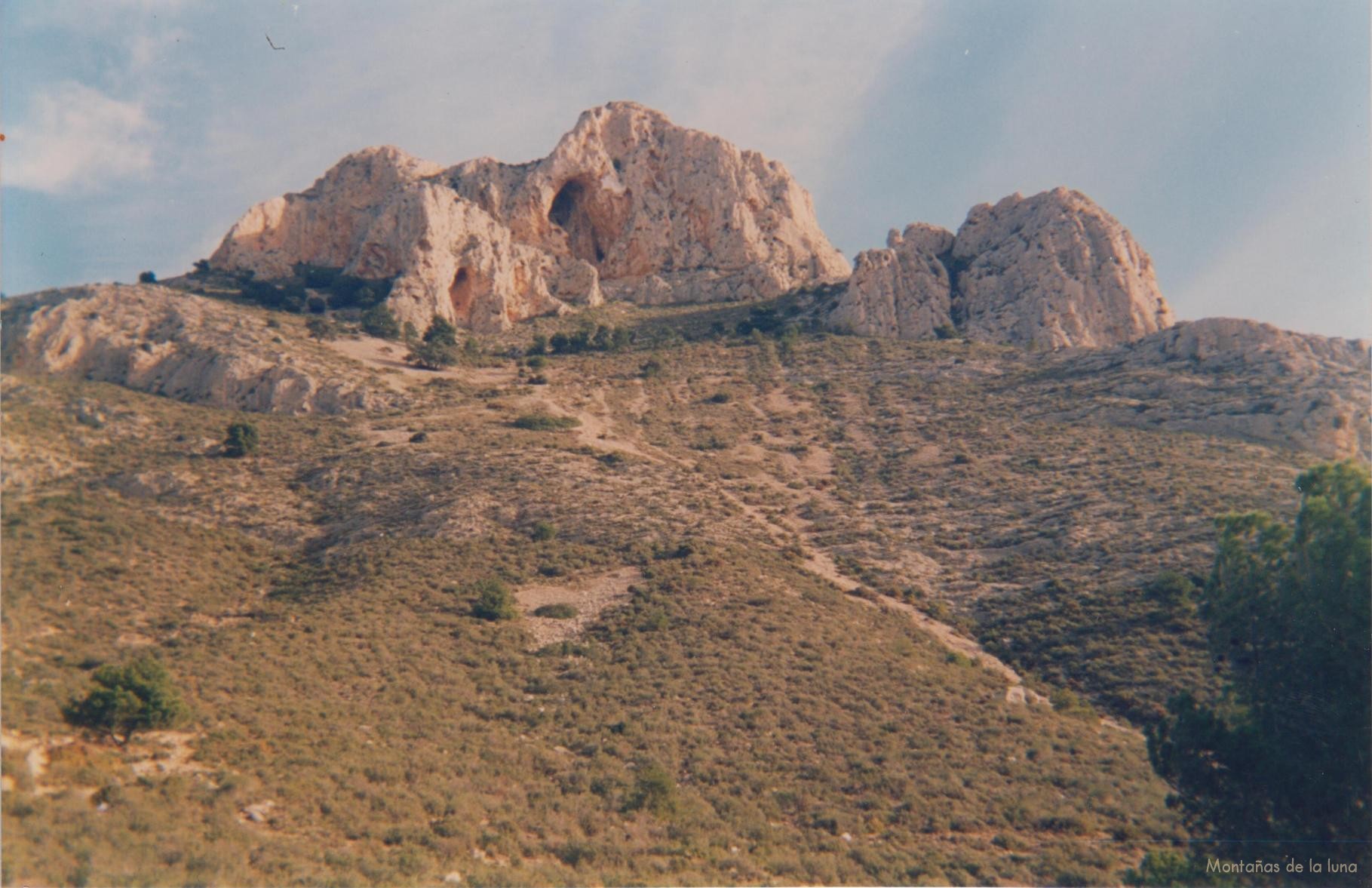 Tibi son dos calles que confluyen en el centro de la población, separadas por un barranco. Un casco urbano curioso. Salimos del mismo por la carreterilla que nos llevaría a Jijona desde aquí, y justo en la parte más alta de la carretera, donde a la derecha sale como una curva asfaltada como si fuera de la antigua carretera, y una casa en alto. Aquí dejamos el coche… aunque a principios de los años 90 la carretera oficial era la asfaltada en la que ahora dejamos el coche. Mirando hacia el norte, hacia la montaña, descubrimos unas laderas rocosas, de roca madre, muy poco matorral, y enormes paredes, cortados con peñones, farallones que quieren resaltar y salirse de la monotonía de la ladera rocosa, con nichos, cavernas que las hacen más espectaculares si cabe… una imagen soberbia y altiva. Pero… ¿Por dónde se sube? No se ve camino, senda o rastro que podamos seguir, que nos pueda guiar… No, subiremos monte a través decidiendo por donde ir, por donde subir, por donde avanzar, mirando los perfiles y formas de la montaña, como viejos exploradores buscando el paso del noroeste, las fuentes del Nilo, la ciudad de oro del Amazonas…