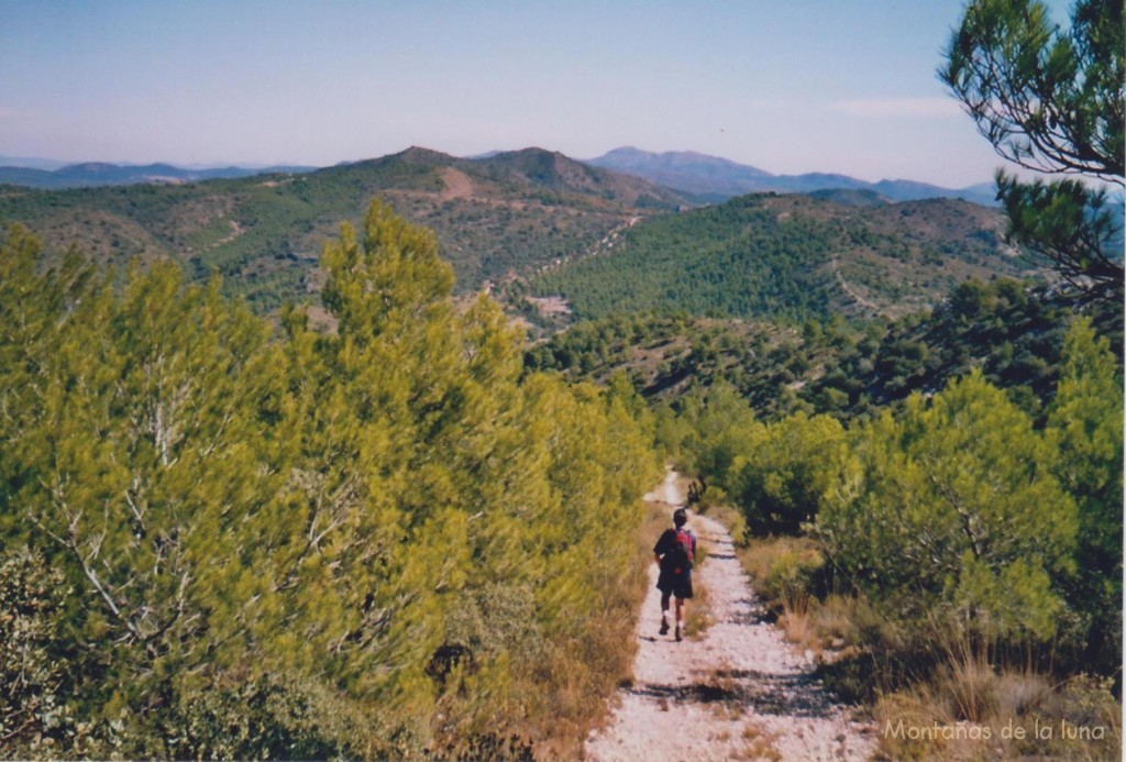 Seguimos este camino sin hacer caso a los caminos que nos salen a la izquierda y que bajan o nos comunican con las masías y construcciones nombradas. A la vez que el camino va girando, cambiando su dirección en un momento hacia el este totalmente, e igual parece que se quiere internar en un hueco de la montaña, acercándose al nombrado collado de Fontalbres. Pero no. Una vez nos sale un camino a la derecha como queriendo seguir rodeando la montaña y su extraordinario bosque, no le hacemos caso y seguimos por la izquierda en la misma pista. Seguimos el P.R. CV-55.