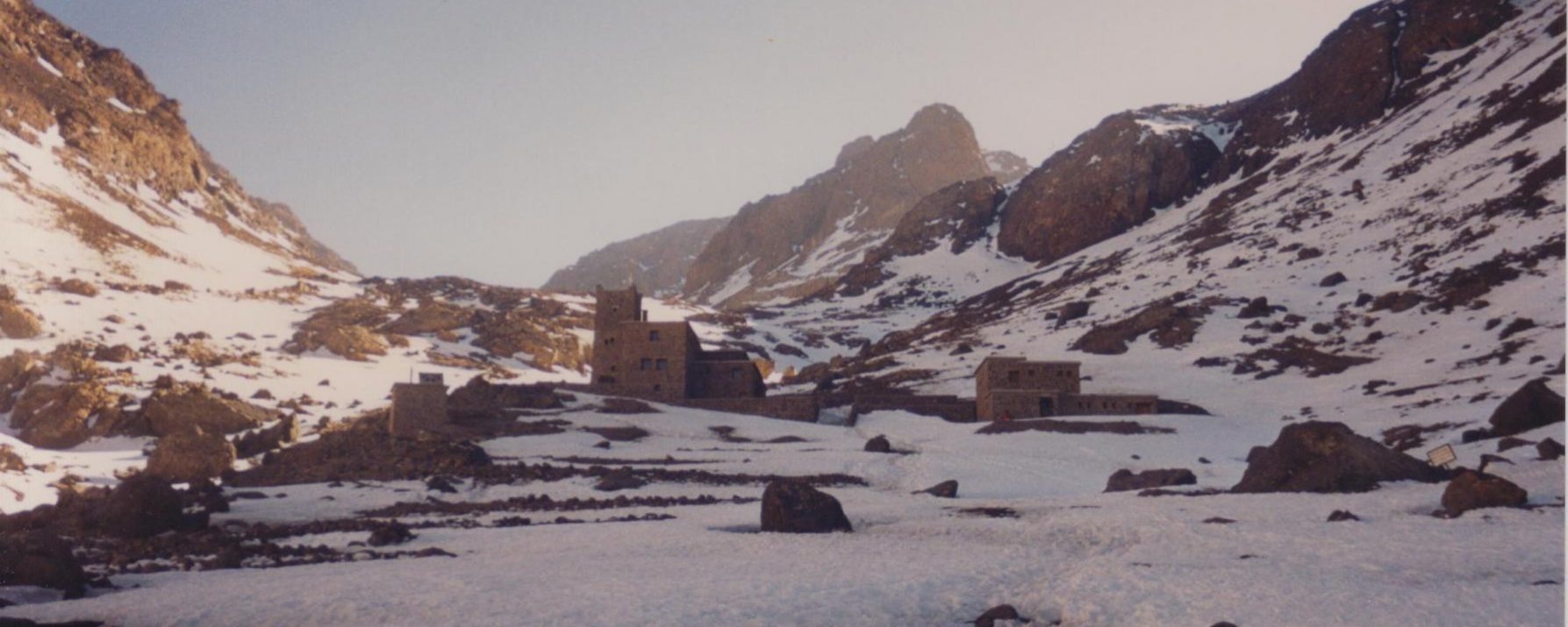 No hay nadie o casi nadie en él, solo los guardas y unas pocas personas, sobre todo franceses de mediana edad, en la chimenea del comedor nos hacemos una foto con una francesa de ojos claros y su guía marroquí. Resulta que el refugio pertenece al CAF, Centro Alpino Francés. Pocas cosas más recuerdo del refugio; un edificio de varias plantas y una torre que hacía como de almena defensora de la Casbah, junto con un patio o espacio al aire libre con otros edificios o refugios. Sí que recuerdo el fétido olor de los baños; unos baños nuevos a los que tenías que bajar unas escaleras frías y húmedas de piedra, pero con una peste horrible y repelente… casi que había que ir con la nariz tapada para adentro.