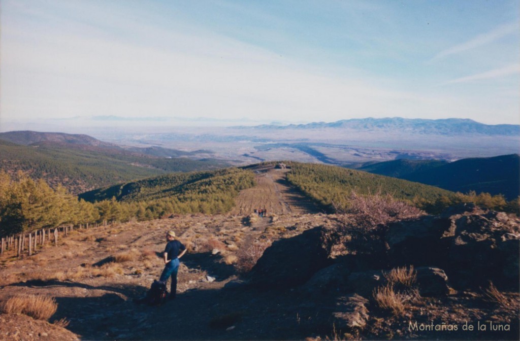 Delante Tomás en el cruce de caminos para seguir por la Loma de Enmedio, atrás queda el Refugio Postero Alto y abajo el llano de la Hoya de Guadix y Marquesado de Zenete con la Sierra de Baza a la derecha. Al fondo casi se percibe La Sagra en el centro, y el conjunto de las Sierras de Cazorla, Castril… a la izquierda