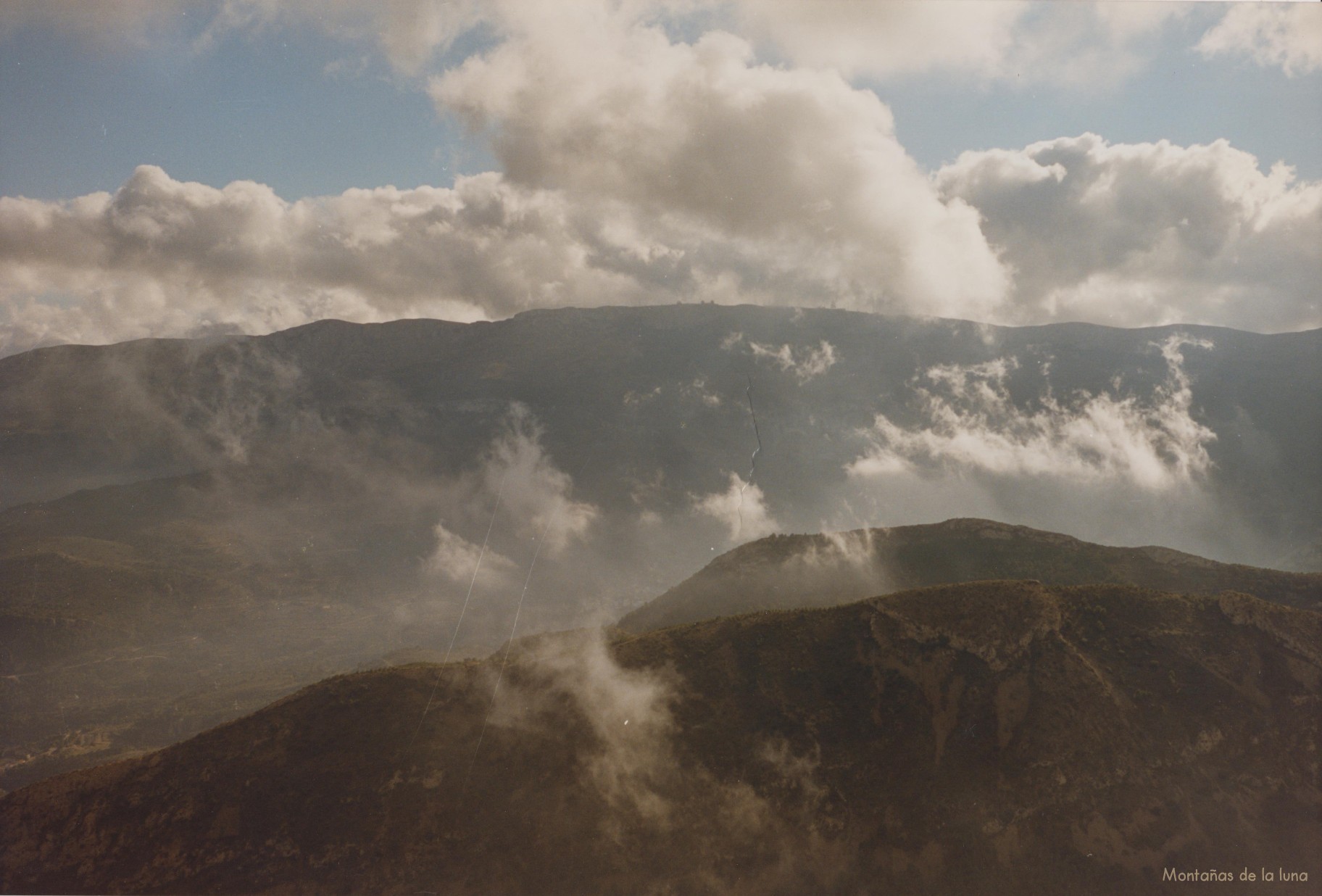 Desde la cima del Pla de La Casa, la Mallada del Llop cubierta por las nubes, en el centro Regall y a la izquierda el Morret de La Terra Nova, entre estos dos detrás, el Cocoll, y la Sierra del Penyal de Laguar a la izquierda
