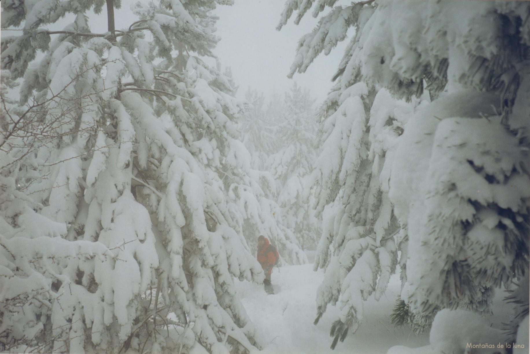 Una vez disfrutado del lugar, seguimos las huellas, la traza hacia el oeste subiendo poco a poco altura y sin dejar de ver las marcas de los P.R., que en ese caso son invisibles bajo la abundante nieve. Llegados a un punto donde hay un siguiente cruce de caminos, muy cerca de la Font de La Forata pero sin pasar por ella, giramos hacia el sur y arriba, dejando las marcas y seguimiento de los P.R., ahora ya no seguiremos los P.R. Delante de nosotros entre las blancas y grises nubes que nos invaden y las blancas, inmaculadas nieves que ahora ya son bastante más abundantes llegando casi hasta la rodilla en algunos sitios, se abre un fantasmagórico y precioso bosque de abetos. ¡¿Abetos?! Altos pero jóvenes, sanos, los cuales aparecen con sus ramas y típicas hojas, agujas, llenas de nieve que aún no ha caído al suelo, dándole un aspecto totalmente alpino, increíble, precioso. La idea es meternos por el límite este del bosque, del abetal, para buscar su espalda y subida inclinada, escarpada, por una especie de pequeña canal, hasta su parte más alta.