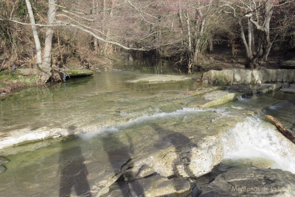 Poco tiempo pasamos junto al templo, junto a sus muros y bancos de piedra, miradores al paisaje, y desandamos la senda, el caminito de subida, que salía de la senda que venía del pueblo de Rupit. Al otro lado, hacia el oeste, se oyen los motores de los coches que pasan por un camino asfaltado cercano, al que tendremos que salir más adelante. Una vez llegamos a la senda giramos a la derecha para seguir la dirección de río abajo, con el caminito muy cerca del cauce. Tan cerca como para poder visitar los gorgs y cascadas que hace el río a la vez que sigue hacia el sur. Con lo que llegamos a un determinado punto y mirando el mapa Alpina, nos metemos en el río entre rocas madre planas, alisadas y lijadas por el paso del agua. Nos acercamos para ver el Salt del Molí Rodó.