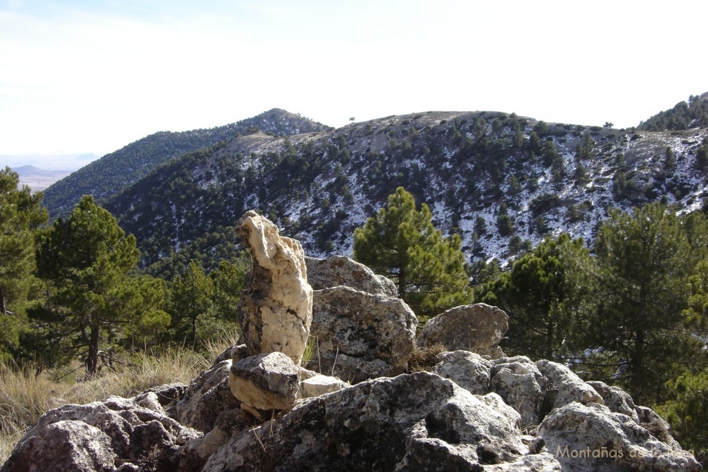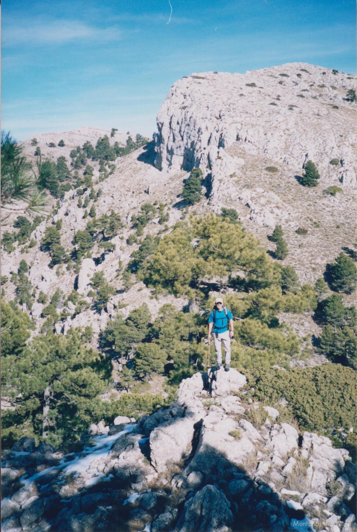Caminando por este altiplano o meseta rocosa, llegamos a un punto de roca, un paso con una pequeña trepada o destrepada entre rocas casi verticales caracterizadas por tener un pino en medio de todo el roquedo. Es emocionante, pero nada difícil y sí entretenido. Le da su toque divertido a esta ascensión al techo de Albacete. Y después de superar esta pequeña pero obligada barrera rocosa, desde su parte más alta, solo tenemos que seguir caminando hacia el oeste, donde ya, caminando algunos minutos más, llegamos a la cima del Alto de Las Cabras.