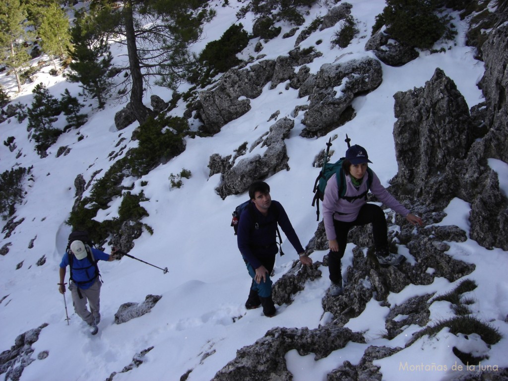 La nieve hace acto de presencia en nuestros pies, y el camino se vuelve blanco al cruzar esta zona de umbría y bosque. Al tiempo el camino cruza un puente en una curva algo cerrada, por aquí aparece otro camino de herradura o ancha senda a la izquierda que parece se quiere internar en la sierra por otro vallecillo. Dejamos el camino principal para coger este camino de herradura hacia la izquierda y oeste. La nieve en el fondo de este vallecillo sigue siendo bastante abundante, y el bosque importante. A los pocos metros nos encontramos una senda o camino de herradura a la izquierda. Por esta será por donde bajemos; mientras seguimos el simpático y nevado camino por el fondo del barranco hacia el noroeste, donde metros adelante y después de brincar del barranco que nos quedaba a la izquierda, a otro paralelo al otro lado de un cordal montañoso, vemos, ahora sí, el desvío a la izquierda para coger una senda hacia el oeste por el fondo del nuevo barranquito. Dejamos el caminito y barranco con dirección noroeste, sureste, para coger este que va de este a oeste. La idea es coger esta senda que al tiempo comenzará a subir por la ladera de solana del barranco, del vallecillo, en donde el bosque aparecerá con ejemplares más dispersos y la nieve irá desapareciendo al ser una zona más tocada por el sol.