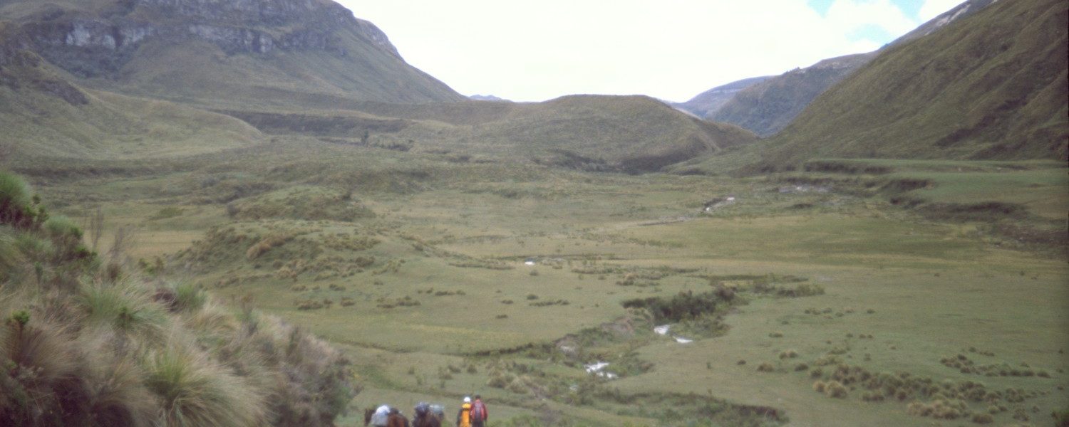 Un camino sale por la parte de atrás de Urbina y gira en busca de la montaña Carihuayrazo, dejando las laderas del Chimborazo a la izquierda. En un principio vamos en camioneta y seguidamente ya caminamos con las yeguas de Segundo cargada con la cocina, los mochilones, las tiendas… la idea era internarnos en lo que llaman el valle del Río Mocha que separa las montañas del Chimborazo y Carihuayrazo, yendo primero hacia el norte, girando para internarnos en el mencionado valle, hacia la izquierda y oeste. También lo llaman Abraspungo. Un valle solitario pero marcado en la Historia de Ecuador, como más adelante nos contará el compañero Jesús en su texto.