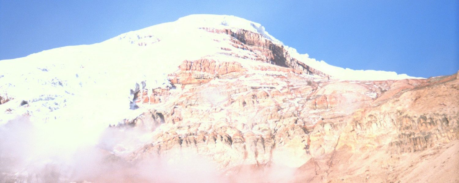 Una vez acomodados en el Refugio Whymper, salimos fuera para ver el extraordinario espectáculo de la vista a la montaña que queríamos subir, conquistar: nos hacemos fotos con Rodrigo, nosotros, con las vistas de las aparentemente altas y a la vez asumibles, laderas marrones anaranjadas del Chimborazo; con sus blancos y colgados hielos en las alturas que parecen se deshacen por minutos ante nuestros ojos. A la derecha, la cima Veintimilla o las estribaciones de la misma, a más de 6.200 mts. de altura; a la izquierda unas rocas más verticales, sin hielo, pero de igual color, más encrespadas y verticales: es El Castillo. Y algo de nieve, hielo disperso, escondido entre fisuras y la arrugas de la montaña… una torre de piedra blanda volcánica culmina la parte más alta de El Castillo. Y las nubes que a veces las tapan y a veces no, envuelven estos espacios que llegaron a considerarse en un momento de nuestra historia, como el lugar más alto del Mundo.