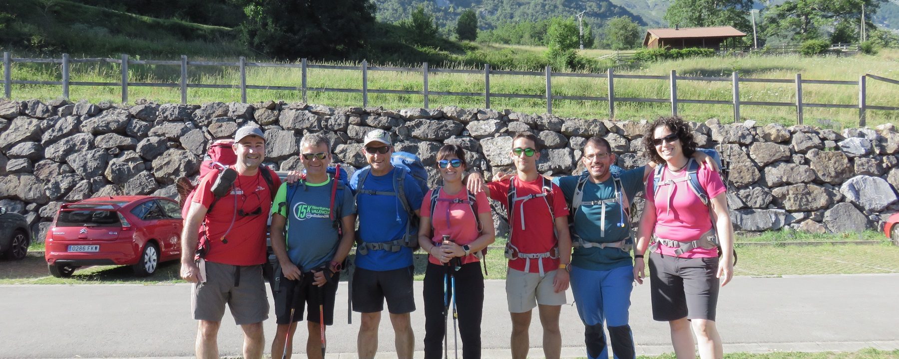 De Izquierda a derecha: Joaquín Terrés, Luis, Joaquín Murcia, Tere, Joaquín Junior, Vicente y Nuria en el parking de Soto de Sajambre