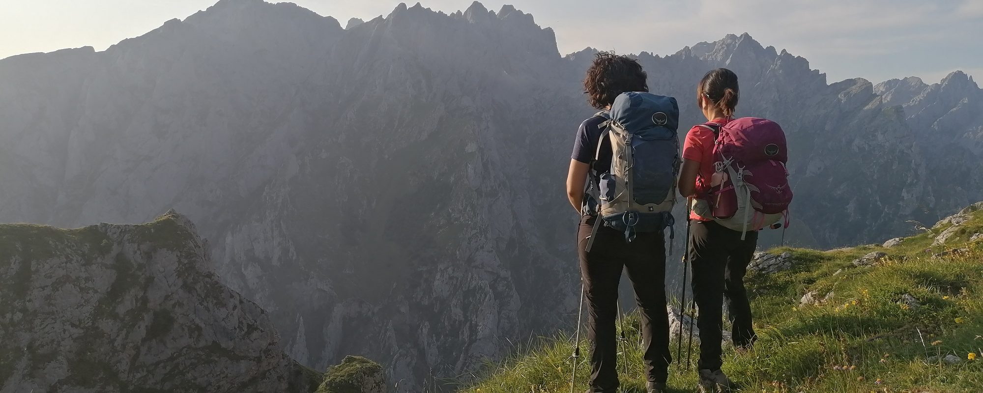 La bajada es un rompepiernas pero es alucinante: pasamos por balcones, esquivamos paredes, escarpes, a veces se vuelve vertiginoso, muy empinado, y otras cruza herbazales, laderas herbosas muy inclinadas y verdes. Pero todo hacia abajo. Así durante más de dos horas.