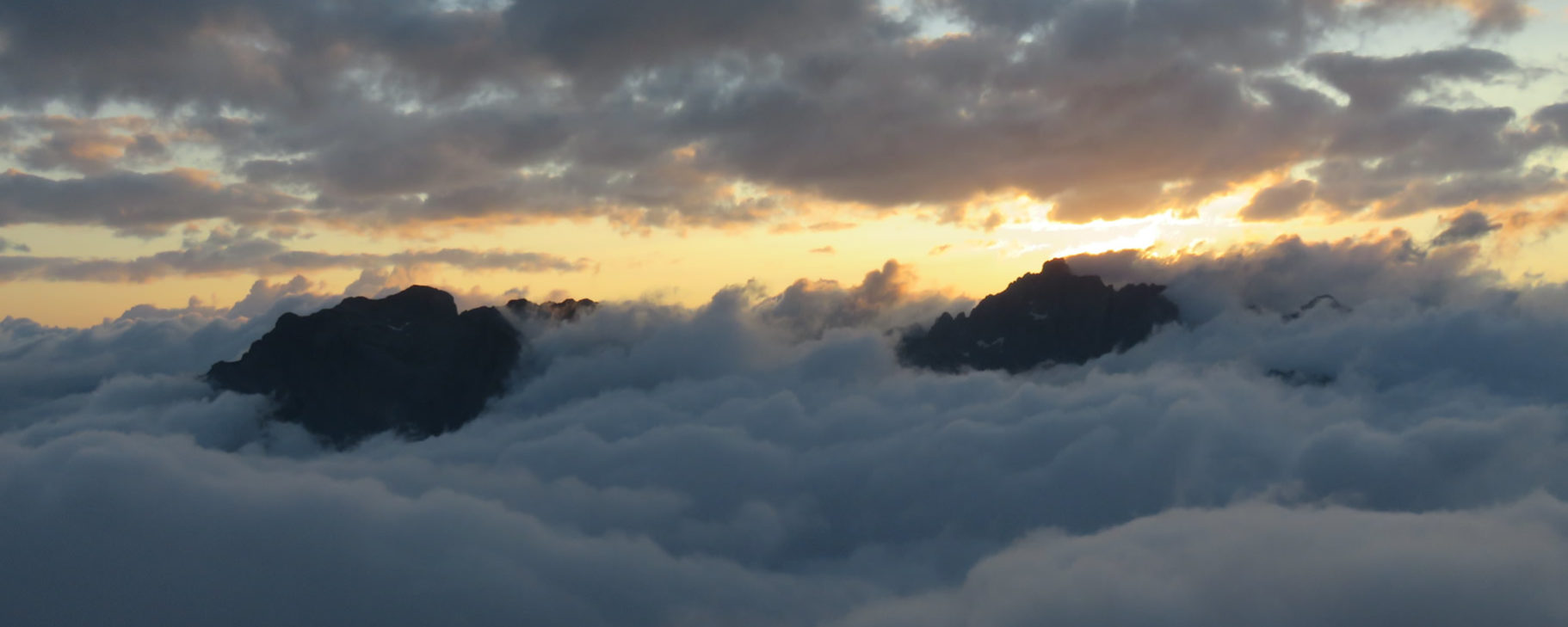 Después de cenar sobre las 19:30 hrs., a las 21:15 hrs. ya estamos sentados o de pie en la cima de la Torre o en el mismo Collado Jermoso (4 pasos distan) para ver el extraordinario atardecer. Decenas de fotos, videos… quiero recoger de nuevo este momento mágico como hace 13 años. Quiero inmortalizarlo mejor, con más medios e ilusión. Es increíble. Los colores comienzan a cambiar, la Peña Santa se cubre, se descubre entre las nubes, las medias, que van y vienen, las bajas ya hacen de Mar de Nubes sobre el valle y bajo la Peña Santa y sus torres y picos adyacentes. Es formidable la visión, el paisaje. A la vez las sombras, la oscuridad van cogiendo terreno, hacen cambiar las formas y las figuras del paisaje, sus colores, sus imágenes, pero sigue siendo la misma montaña. El sol, al cabo de 30 a 45 minutos ya se ha puesto por detrás del Macizo de Cornión lleno de nubes, por debajo el Mar de Nubes, dejando a la Peña Santa y a Torre Bermeja como dos verticales islas oscuras y tenebrosas, entre un mar azul oscuro que se va apagando con el paso de los minutos y con un horizonte lejano con cada vez menos luz amarilla, anaranjada, brillante, tenue, la cual se va apagando poco a poco… hasta desaparecer. Precioso. Soberbio. Hermoso.