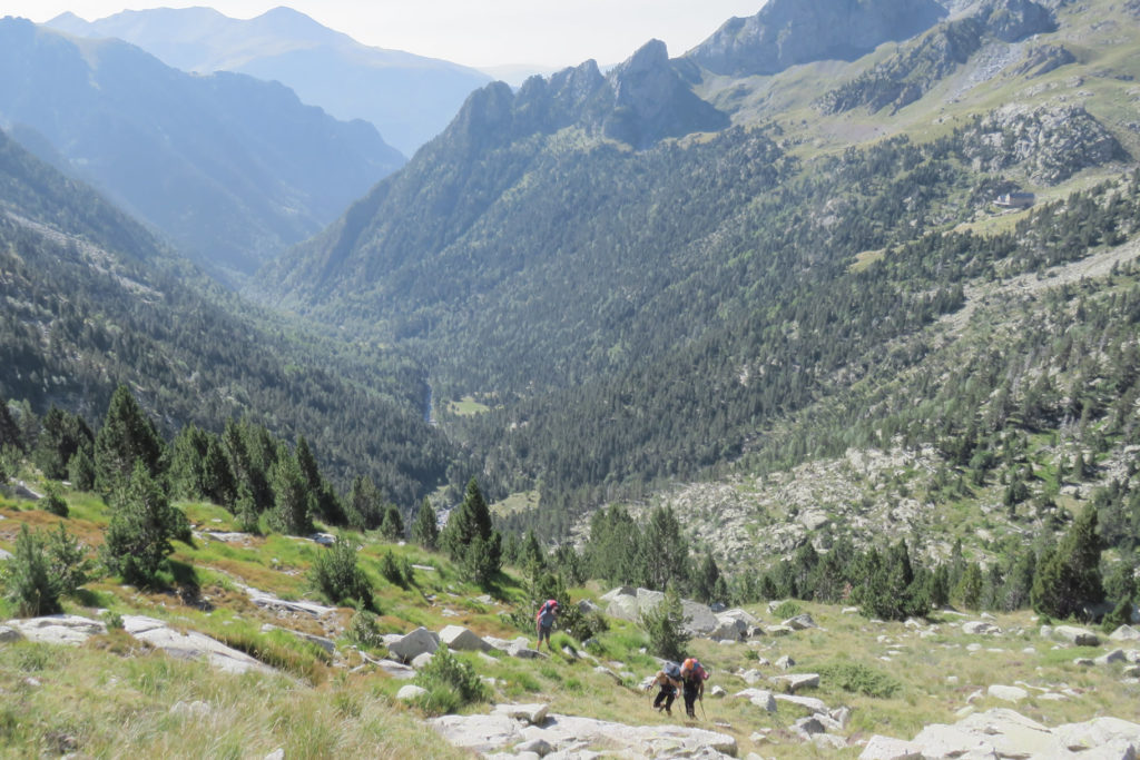 Seguimos por la senda ahora sin más esfuerzo que el caminar entre las rocas por la cómoda y llevadera senda, después de la empinada subida monte a través, es un recorrido fácil y casi monótono. El valle de Eriste nos queda abajo a la derecha y casi a la espalda, dejando un magnífico paisaje de bosques y prados, escarpadas alturas rocosas y suaves laderas angulosas.