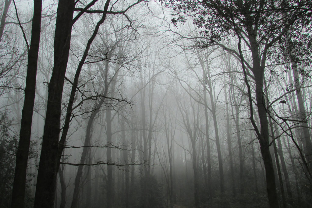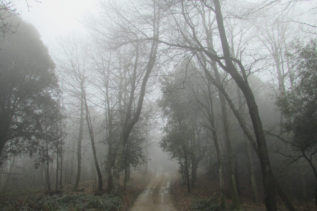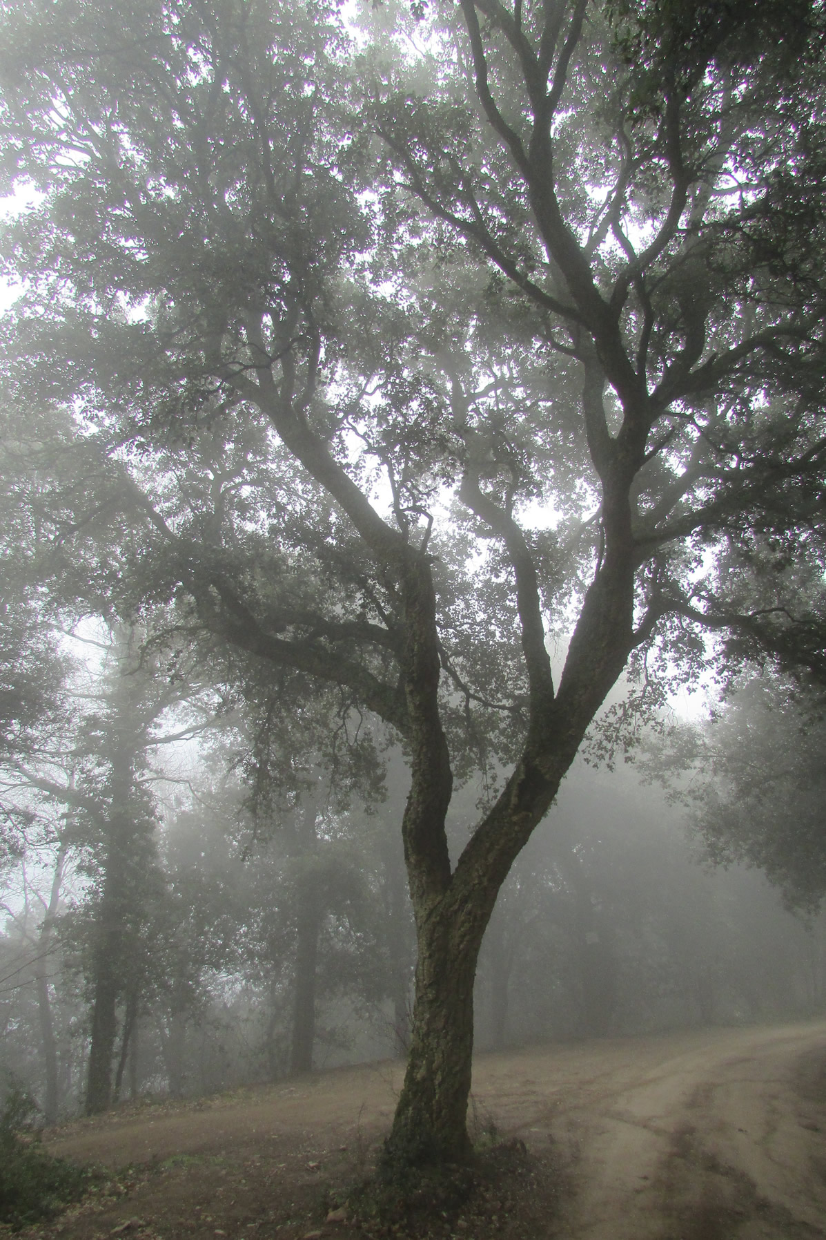Después de pasar por la cima más alta del Montnegre sigo por el camino hacia el este; no he dejado de seguir el recorrido de La cima del Montnegre. El paisaje sigue siendo excepcional, muy de Tim Burton, casi gótico entre estos excepcionales ejemplares desnudos de hojas muchos de ellos, la niebla gris, profunda, intimidatoria y el frio, la humedad… casi de cuento, de pesadilla… Fantástico y magnífico. Me encanta.