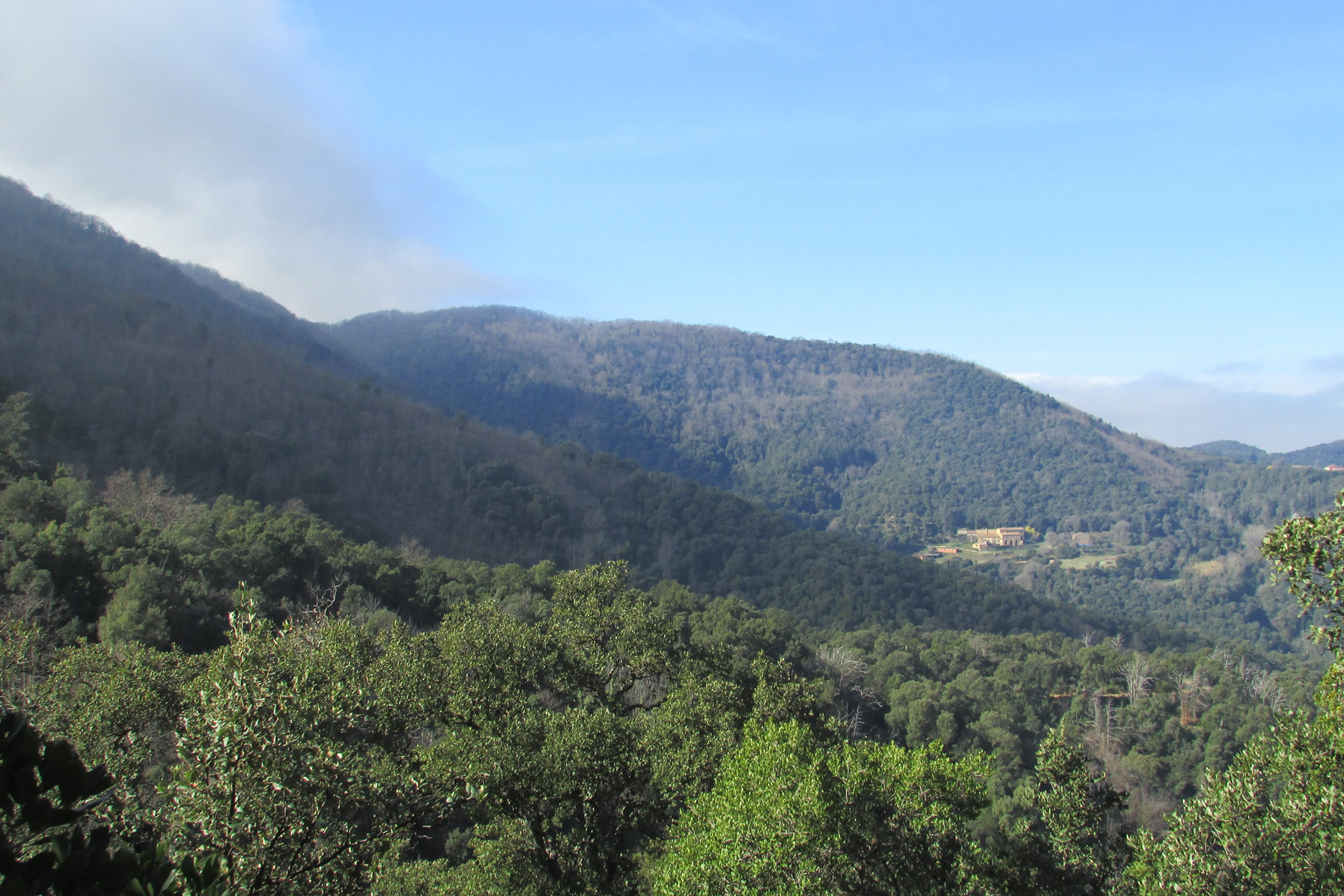 Pero el camino desaparece en un punto, sigo una especie de traza, que no llega a ser una senda, yo mismo tengo que seguir por el mejor sitio con la intuición montañera, monte a través, en busca de otro punto más adelante sin bajar del cordal, que me bajará a la izquierda a otro camino más o menos bien señalado. Éste sigue, como la pista, por el perfil de la montaña de oeste a este pero a unos metros más abajo de la misma pista, paralela a ella. Pues bien, bajo a este camino que me lo encuentro a la izquierda en la ladera del cordal, y lo sigo hacia la derecha, hacia el norte. Este camino hará giros y seguirá el perfil de la montaña, pasando del lado este del cordal, al norte o noroeste del mismo, ya mirando hacia el valle donde se encuentra el Pantà de La Brinxa. Antes el ir por la parte más alta de la Carena de La Rompuda he podido admirar el paisaje de todo el monte boscoso del Montnegre hacia el este, identificando la magnífica masía de Can Preses en mitad de la boscosa ladera. Precioso. Arriba girando la mirada hacia la izquierda, quedan las cimas del Montnegre aún tapadas por las nubes, las nieblas; aquí abajo, mientras llegaba a Santa María de Montnegre hacia abajo, ya no atravieso esas nieblas, y el sol sin una nube es el predominante en la montaña.