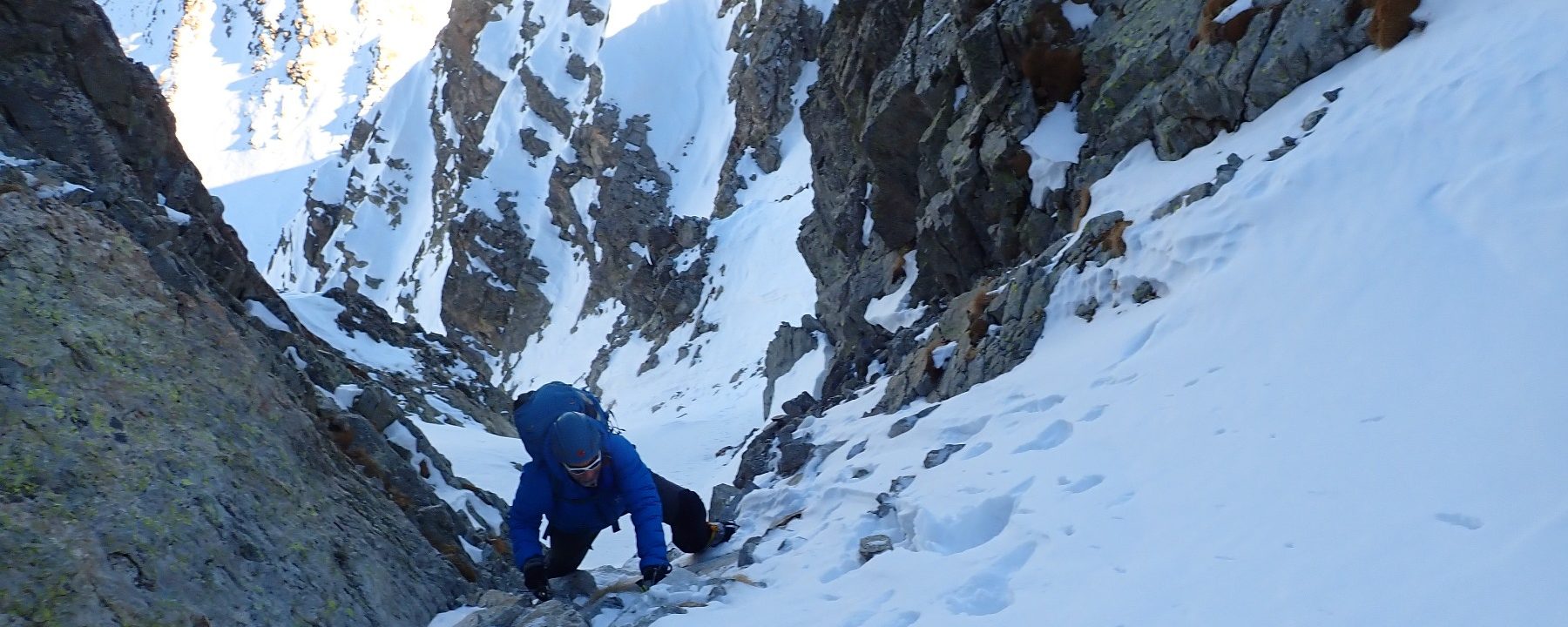 Intento hacer fotos de mis compañeros con la perspectiva del corredor en toda su amplitud. Y Gallemí poco a poco me va cogiendo terreno. Llego a un punto del corredor el cual gira a la derecha, cuando a la izquierda entre rocas parece que es un escape, una salida a la cresta norte de la montaña. Espero a Gallemí. El corredor de la derecha es más estrecho e inquietante, a la vez supongo que interesante. Le pregunto a Gallemí si seguimos por éste; siempre podremos volver a la zona de escapada si más arriba el corredor no está en condiciones o no podemos avanzar. Por ello hacemos el giro, obviando el escape del corredor enfrente o izquierda, y seguimos por una canal más estrecha, la cual vemos a mitad de la misma un paso de mixto: rocas en mitad del corredor, una descontinuación de la pala de nieve…