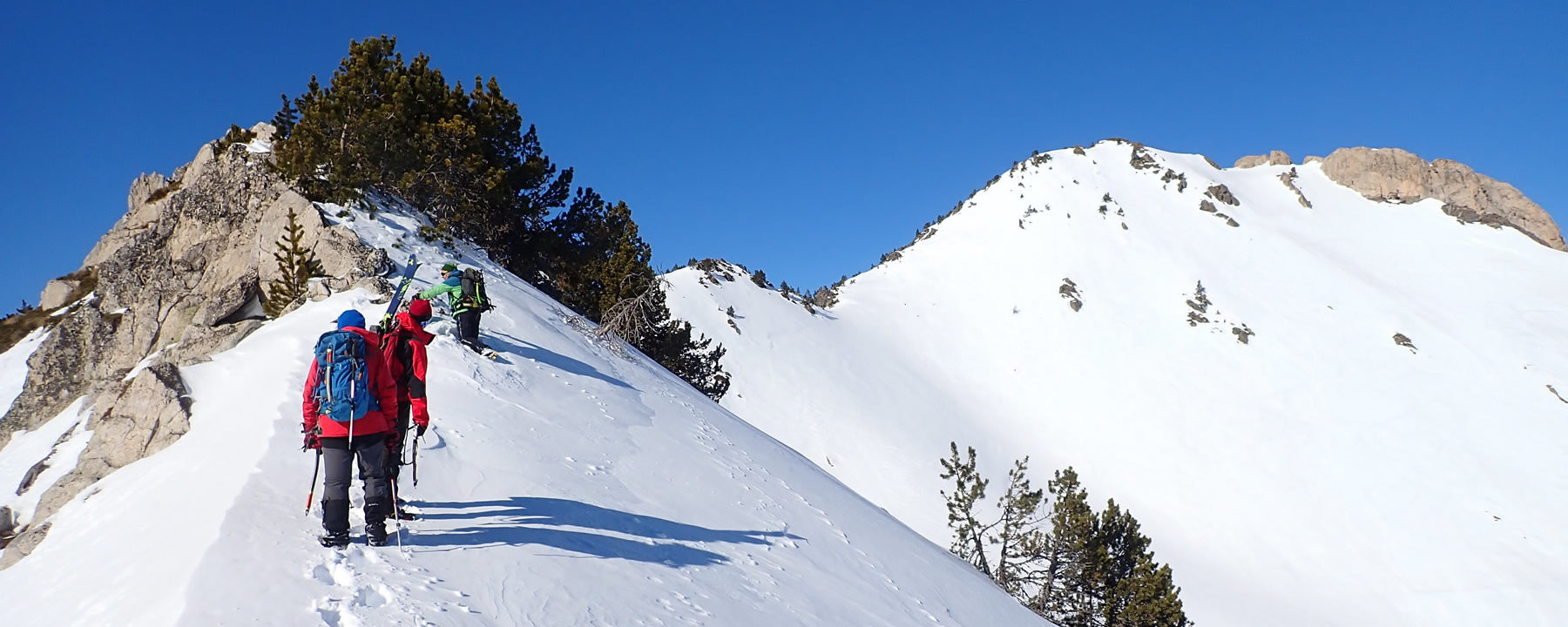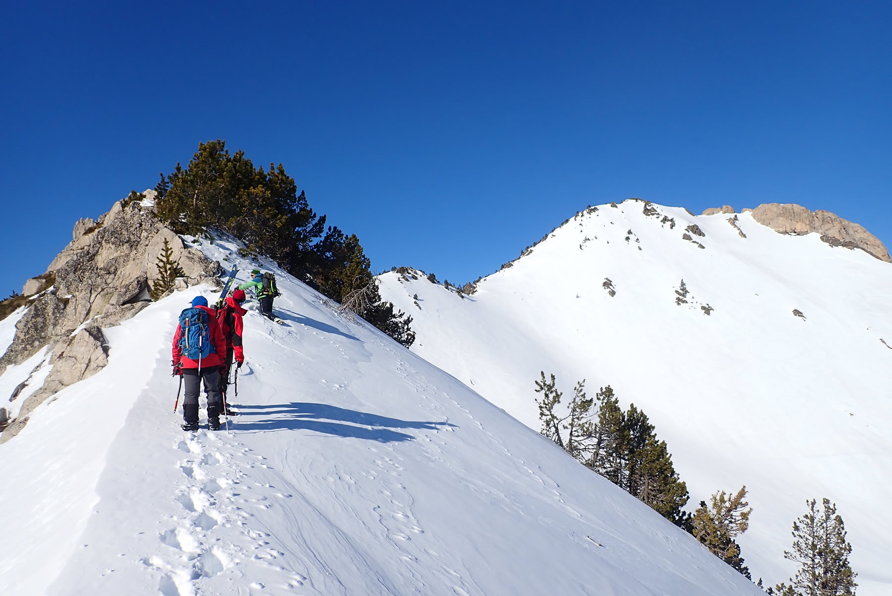 De vez en cuando los compañeros me oían refunfuñar. Me molestaba y desgastaba este progreso monte a través con tantos pinos, ramas, rocas y pasos estrechos, de la cresta. Es cierto que la actividad era más técnica y entretenida, interesante, que bajar y caminar por la abundante nieve. Pero a Gallemí que le encantan este tipo de progresión, iba delante abriendo camino cresta arriba. Llega un momento que la pendiente de la derecha no era tan inclinada y el fondo del mismo se acercaba o no era tan profundo; y a la vez la cresta hacia un arco acercándose a las ladera de subida ya al Pic de La Tribuna. Nos quedan dos o tres pequeñas alturas en la misma cresta ya más fáciles de cruzar, de atravesar. Eso sí, el espectáculo es formidable, agreste e impresionante mientras progresamos por esta cresta. El día se mantiene perfecto y con muy buena visibilidad, con algo de viento y fresco, frío, normal para la época.