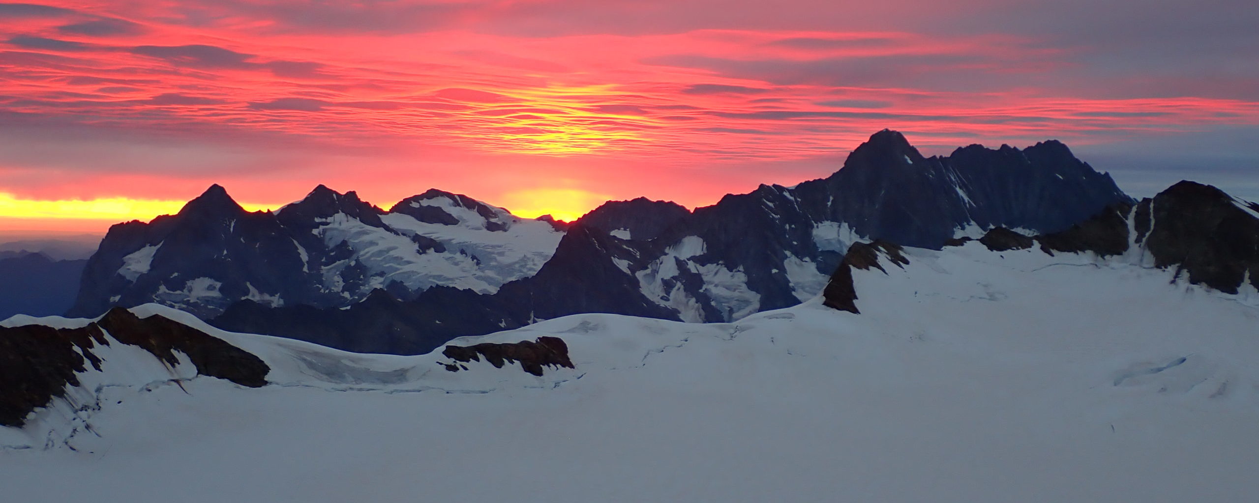Amanece en el Refugio de Mönchjoch, 3.657 mts., con el circo o plateau del Glaciar Ewigschneefäld abajo y detrás a la derecha sobresale el Schreckhorn