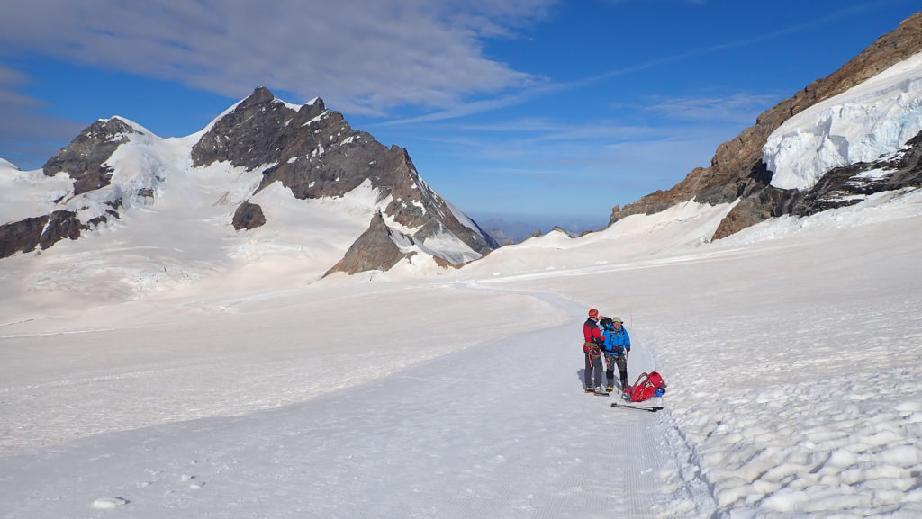 Bajando por el camino o la pista de nieve, hielo, que comunica Mönchjochhütte con Jungfraujoch, no nos encontramos a nadie, es muy temprano para el turismo, a lo mejor para el primer tren cremallera, ese famoso tren, que saliendo de Interlaken nos deja en este alto collado de la alta montaña alpina. Aprovechamos para caminar sueltos, alegres y sonrientes, a pesar de no haber podido subir ninguna de las montañas que nos hemos propuesto, estamos disfrutando de unos días y actividad única para un “montañero de a pie”. Seguimos las mismas huellas y camino de ayer, no hay pérdida. Llegados a Jungfraujoch giramos a la izquierda glaciar abajo. Atrás dejaremos el Jungfrau y su interesante, extraordinaria subida, y más a nuestra espalda la capa, la capucha del monje, por la que no hemos podido subir, el Mönch. Pero ahora las vistas hacia el frente, bajar por todo ese valle enorme protagonizado por este extenso y gigantesco glaciar, con sus grietas, formas, morrenas alineadas… serán las que capten el objetivo de mi Olympus. Nos da la impresión de estar metidos en una aventura de aquellos exploradores de finales del sigo XIX, cuando se perdían por la Antártida, Patagonia, Himalaya, entre sus glaciares y valles inhóspitos, imposibles de habitar, magníficos, solitarios, indómitos. Magníficas fotos.