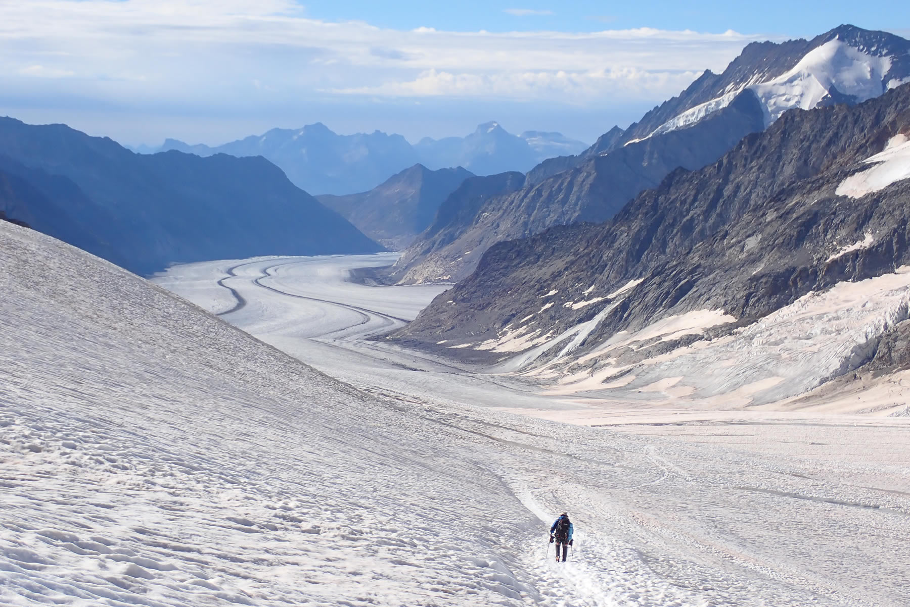 Son aproximadamente las 8 de la mañana cuando salimos del refugio en busca del final del Glaciar Aletsch. Casi que en esta actividad haremos su recorrido desde su nacimiento hasta poco antes de su extinción, por todo su enorme y ancho valle glaciar. Excepcional. Pero ahora en bajada hasta poco antes de Konkordia, y después llano, lo llano que nos deja las olas de hielo del glaciar y sus grietas…