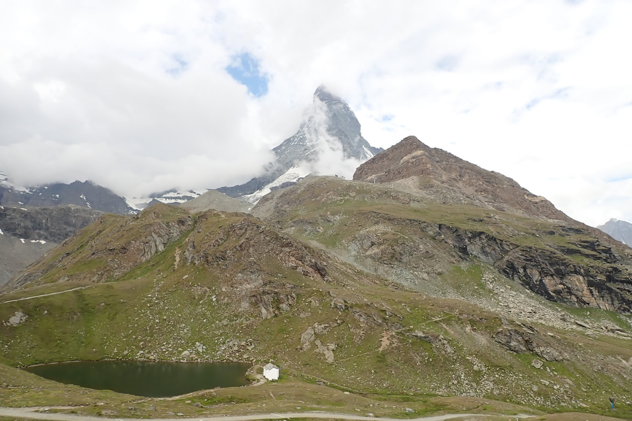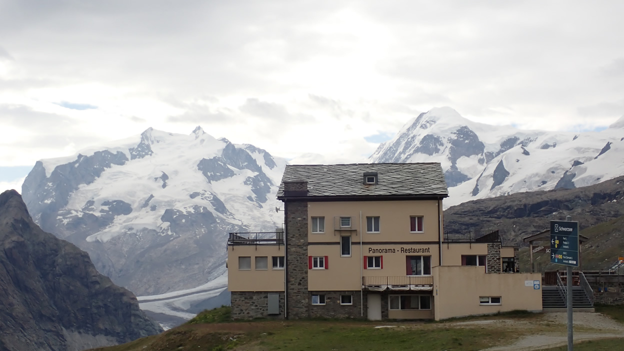 Desde Schwarxsee, 2.588 mts., detrás a la izquierda el Nordend y la Dufourpitze, en el Monte Rosa, detrás del edificio del restaurante, el Liskamm