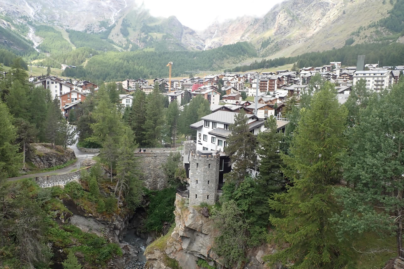 Las vistas y ubicación de Saas-Fee no tienen nada que envidiar a Zermatt. De hecho, si no fuera por el Cervino, las vistas, paisaje y lugar de Saas-Fee podrían ser igual de idílicas que la de su competidor y famoso Zermatt. Rodeada de un bonito y pequeño bosque, con las desnudas laderas erosionadas por los antiguos hielos, de roca que te suben, metros y metros hacia arriba, hasta las alturas y glaciares de alta montaña. El pueblo también es encantador y muy visitado, con esos cochecitos eléctricos, como los de Zermatt, que recorren sus calles, ya que los grandes coches de combustibles fósiles no pueden entrar, todos se quedan en el parking.
